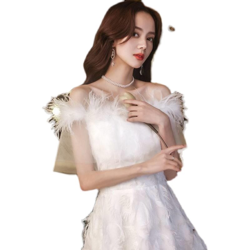 您的位置:他他商城  >   >  白色羽毛晚礼服裙女2025年新款高端设计生日宴会一字肩连衣裙仙气