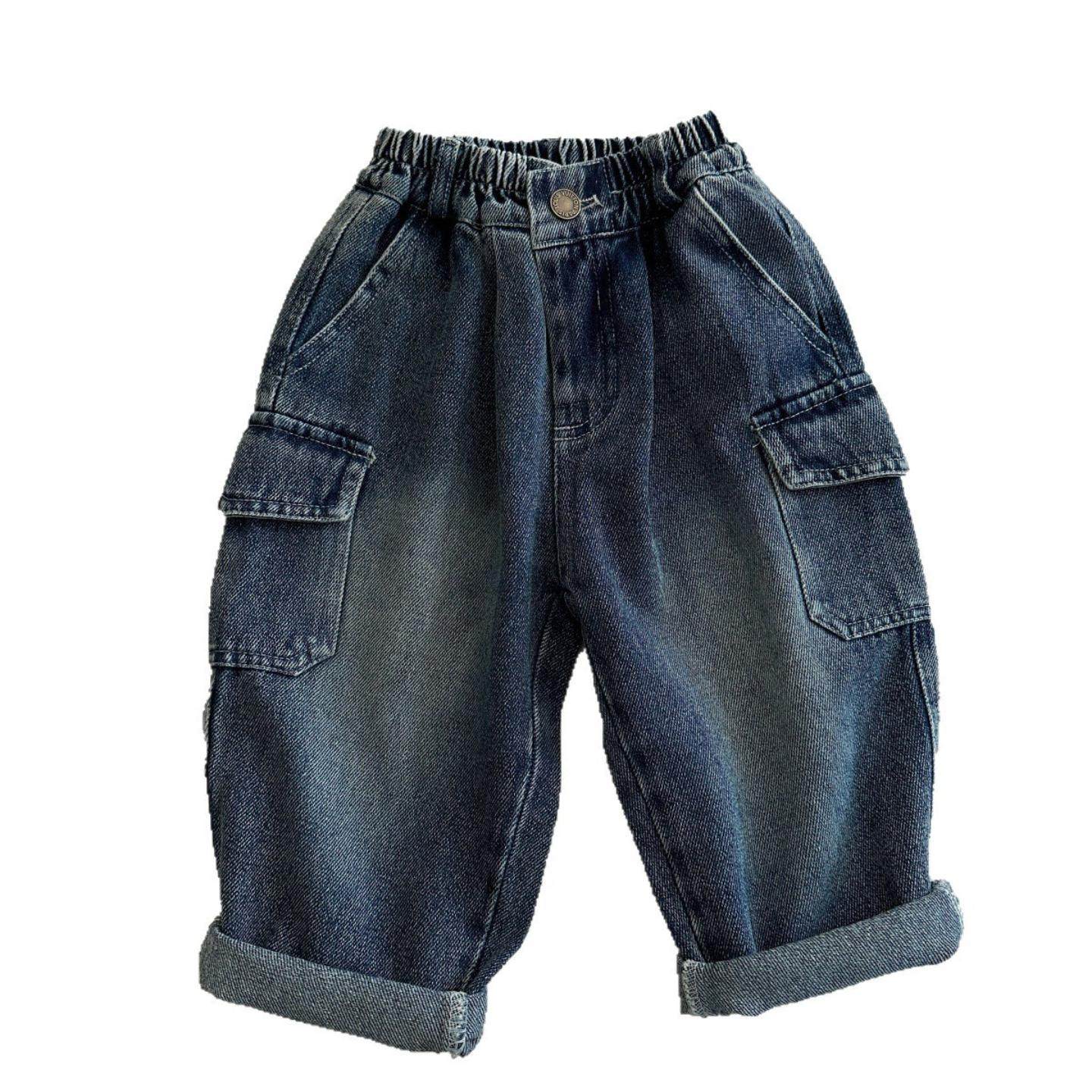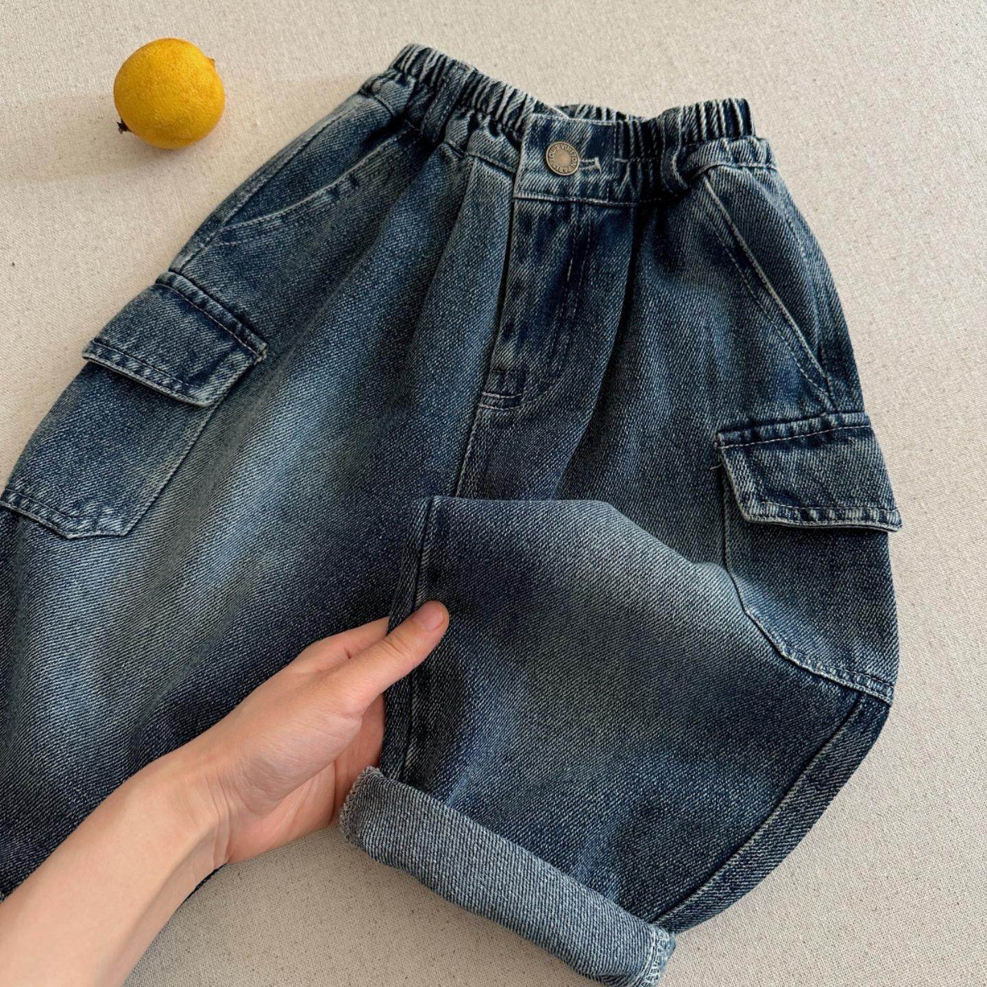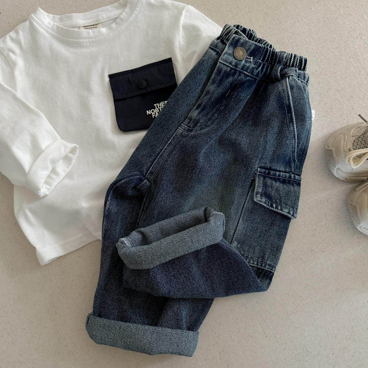 儿童牛仔裤2025小布熊春秋季男女童纯色口袋牛仔裤宝宝工装直筒裤 - 大鹏展翅臻选店
