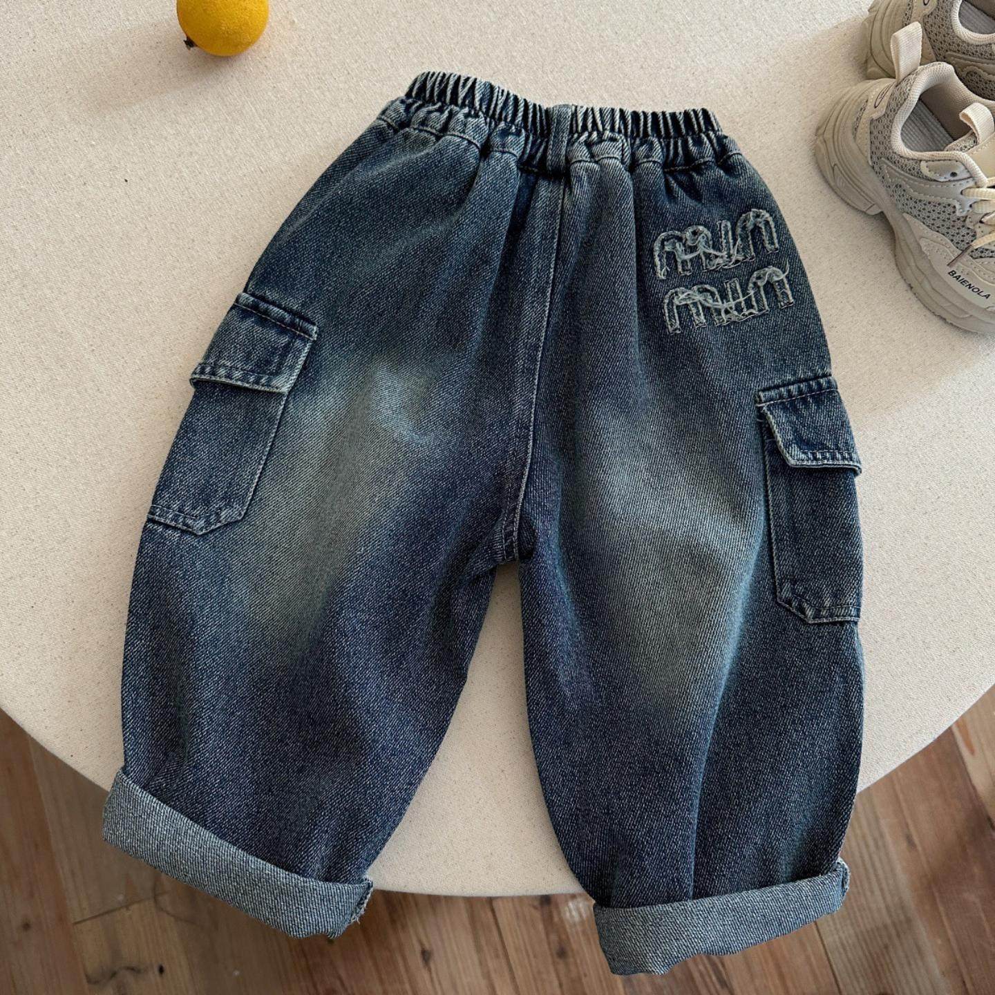 儿童牛仔裤2025小布熊春秋季男女童纯色口袋牛仔裤宝宝工装直筒裤