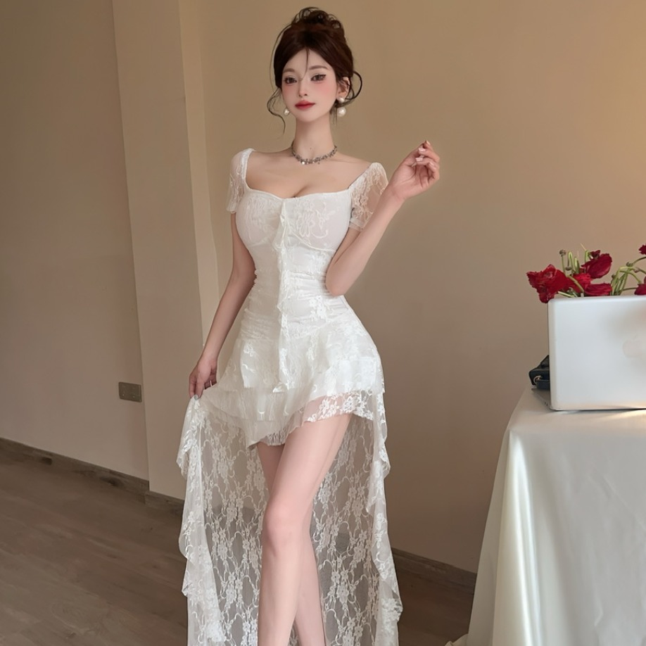 您的位置:他他商城  >   >  2025新款气质性感纯欲风前短后长不规则在逃公主蕾丝短袖连衣裙女