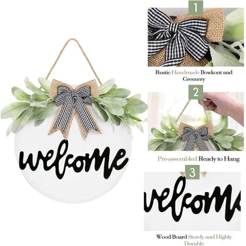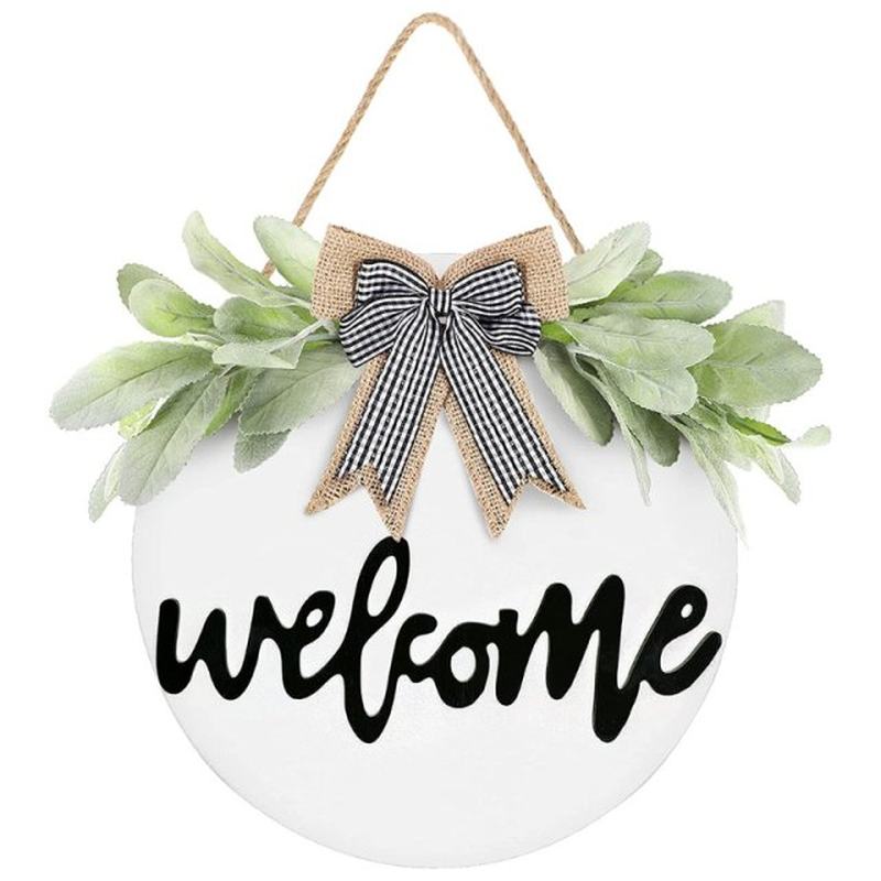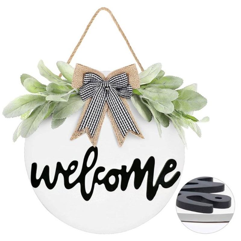 Simulation Wooden Wreath Hanging Sign with Bowknot Greenery - 汇辩商贸