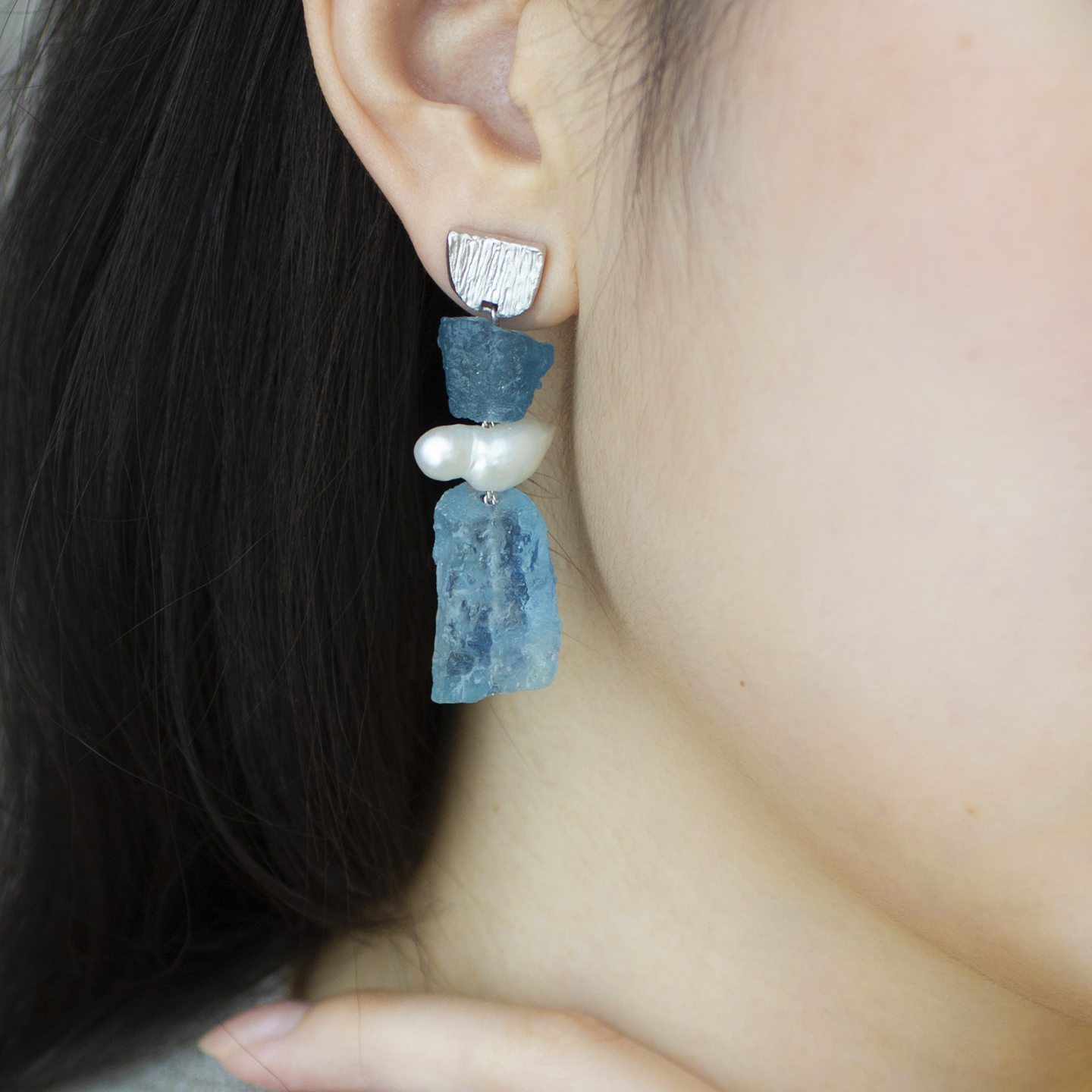 朗睦原创天然海蓝宝原石限量手工新品珍珠银针耳环女小众设计耳饰 - Larmo朗睦原创首饰