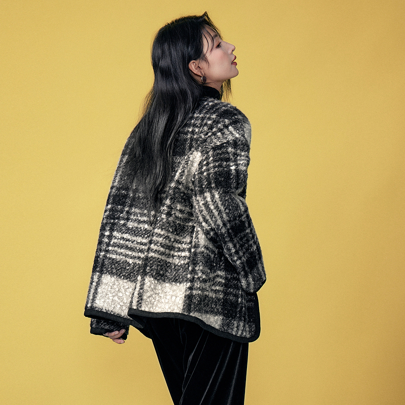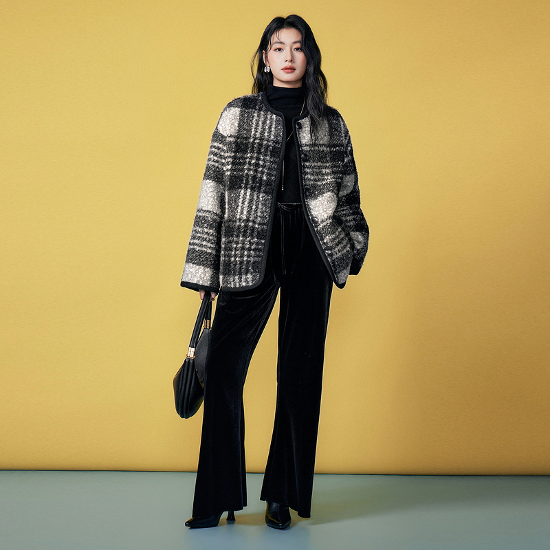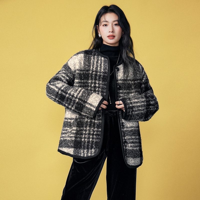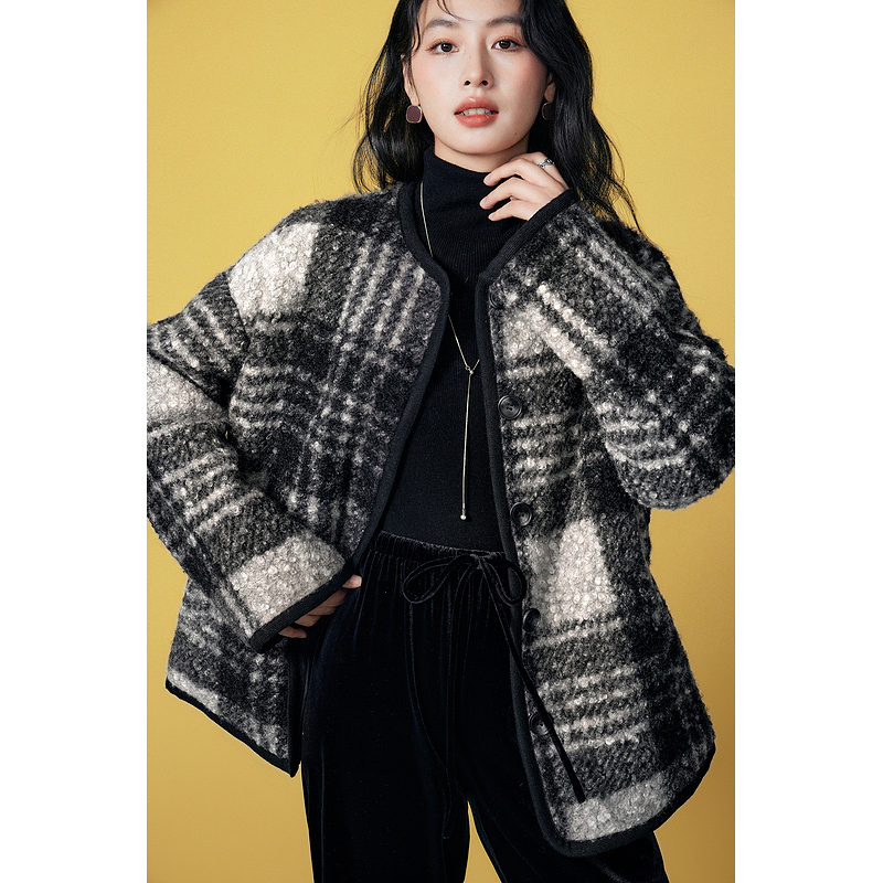 Basic House/百家好小香风圆领格纹毛毛外套复古摇粒绒宽松上衣冬 - BASICHOUSE女装旗舰店