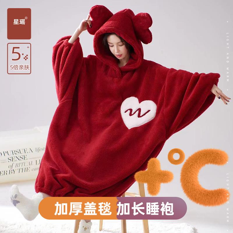 冬季睡衣女大尺码连身睡袍加厚珊瑚绒保暖超长大睡裙盖毯式连帽睡