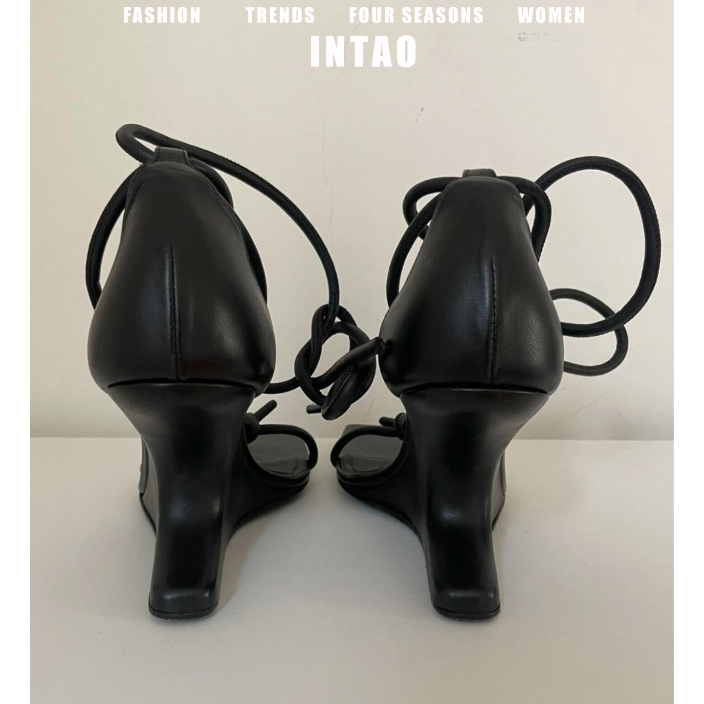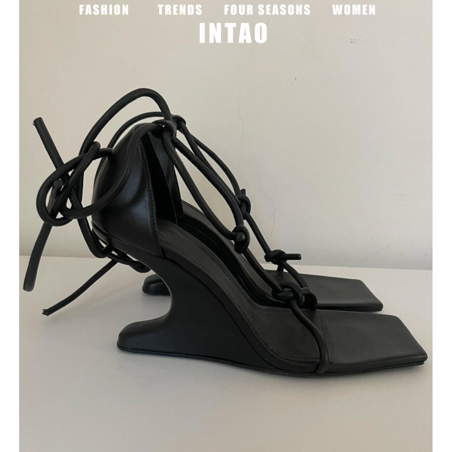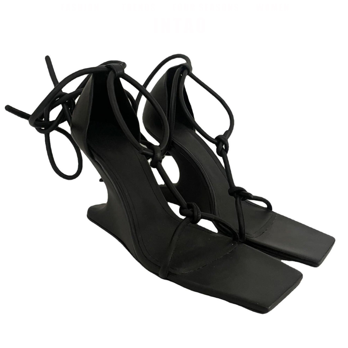 小众设计感黑色坡跟绝美凉鞋女2025夏季新款不累脚交叉绑带高跟鞋 - INTAO樱桃女鞋馆