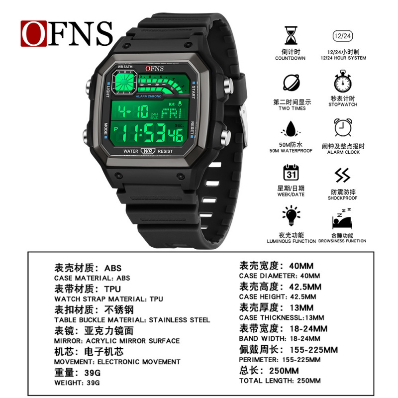 您的位置:他他商城  >   >  Ofns男士学生手表经典方形夜光倒计时多功能闹钟日历运动休闲腕表