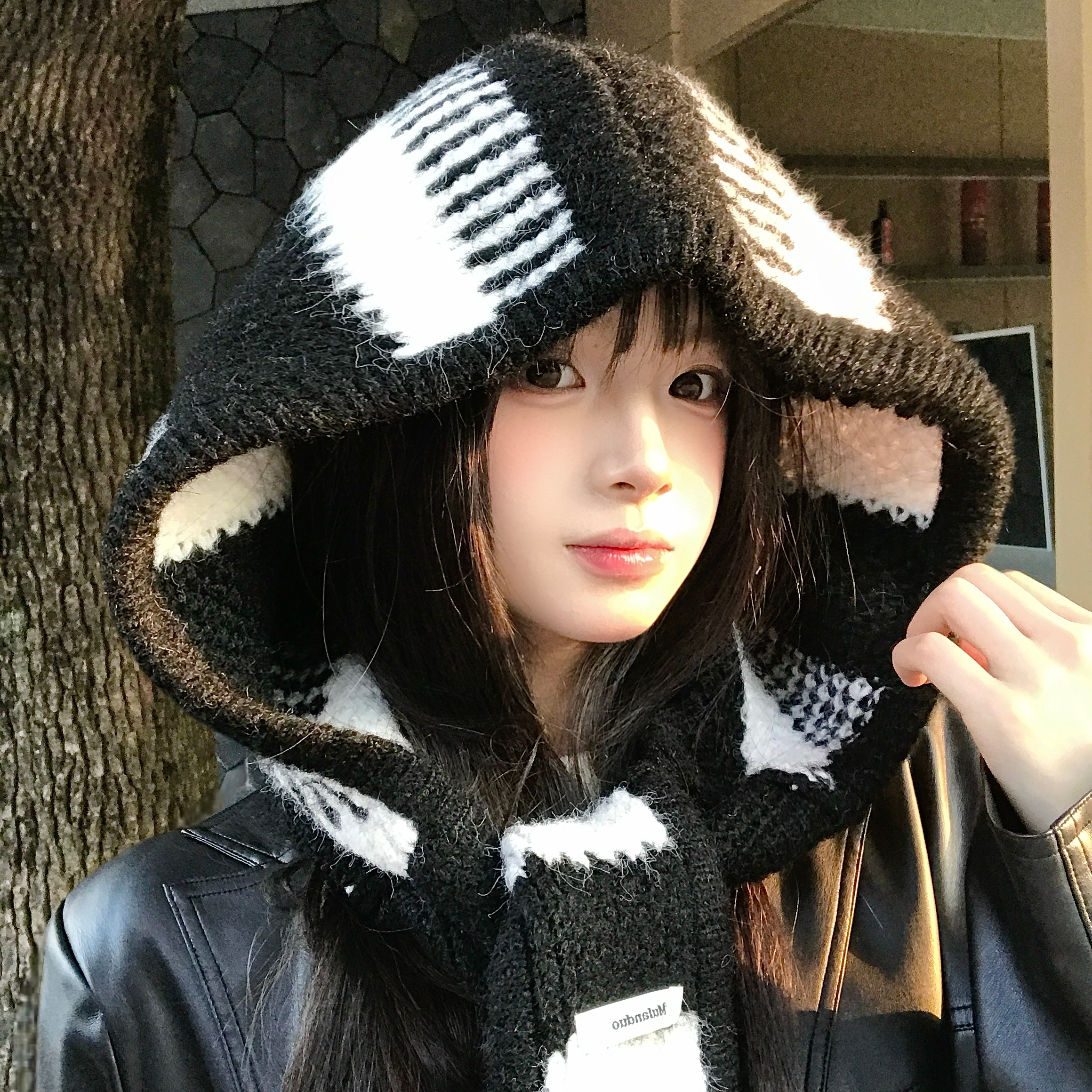 黑白条纹针织巴拉克拉法帽女秋冬帽子围巾一体加厚保暖防寒套头帽 - 帽右右