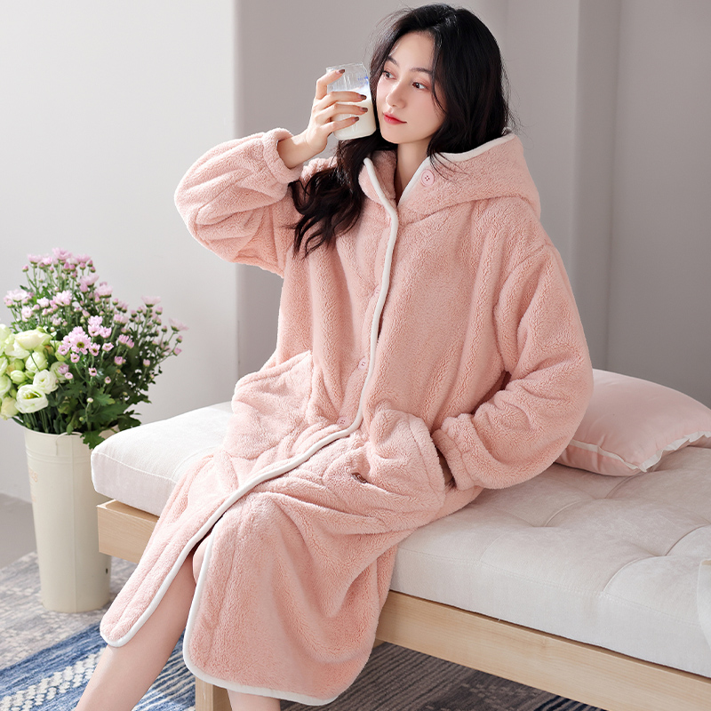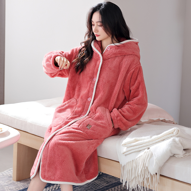 睡袍女冬季珊瑚绒加厚加绒浴袍睡衣女款秋冬法兰绒可外穿长款浴衣 - 卡森兰品牌直销店