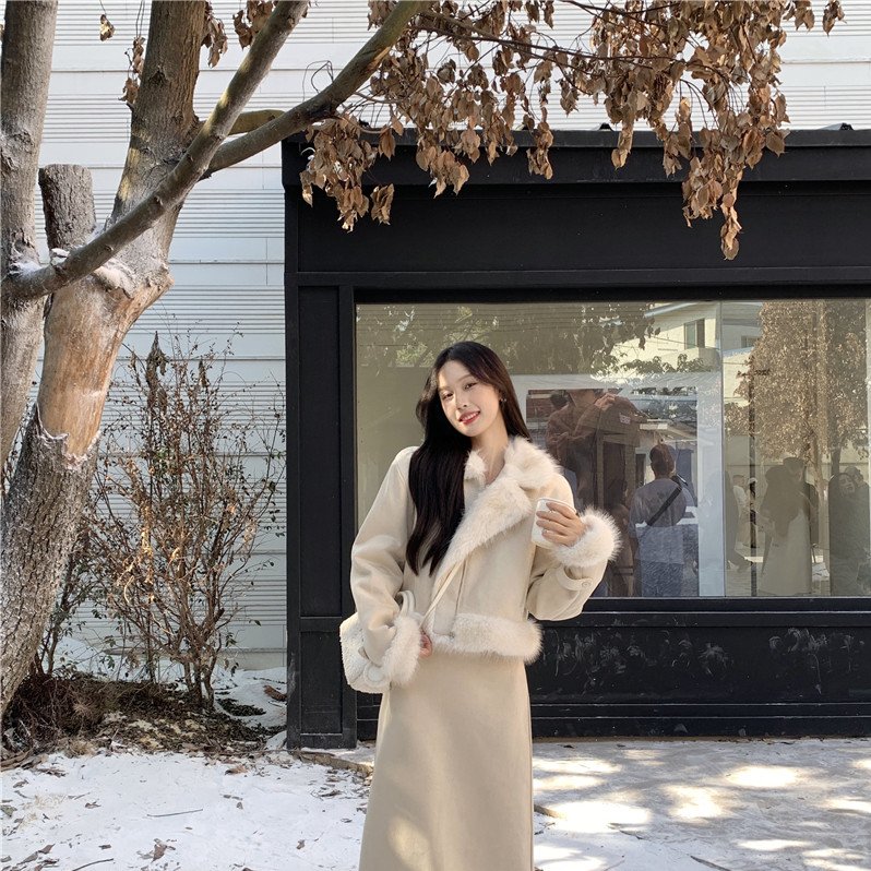 实拍实价~洋气鹿皮绒毛领冬季加厚名媛保暖夹棉外套+半身裙套装 - 浅栗社