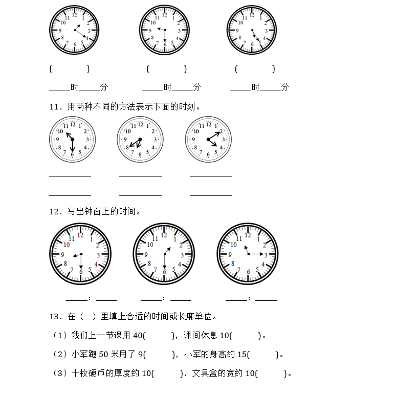 二年级上下册认识时间钟表时分秒单位换算分针选择填空判断题练习