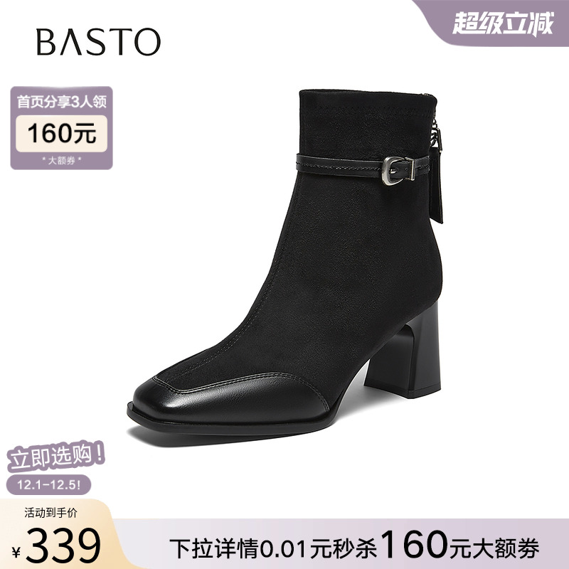 百思图2025冬季商场新款粗高跟法式女短靴绒面拼接马丁靴F2178DD5 - 百思图官方旗舰店