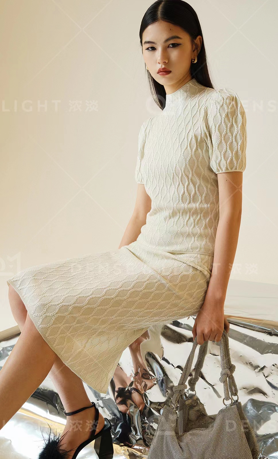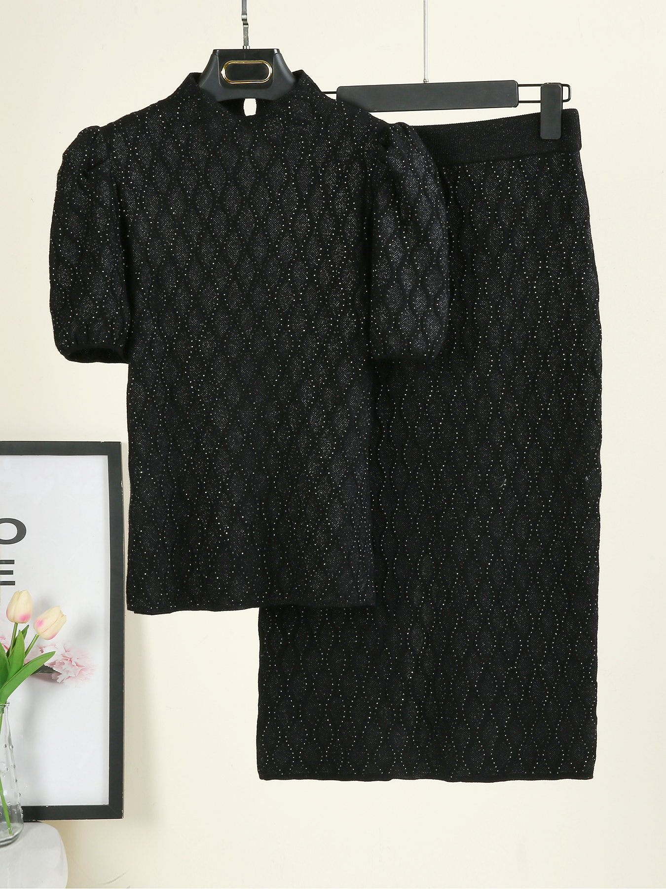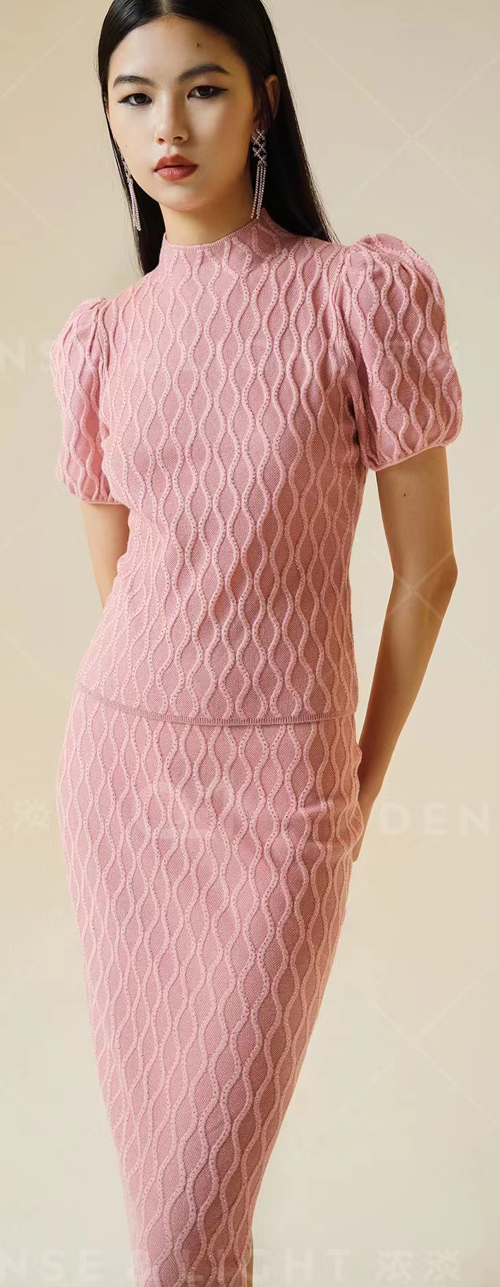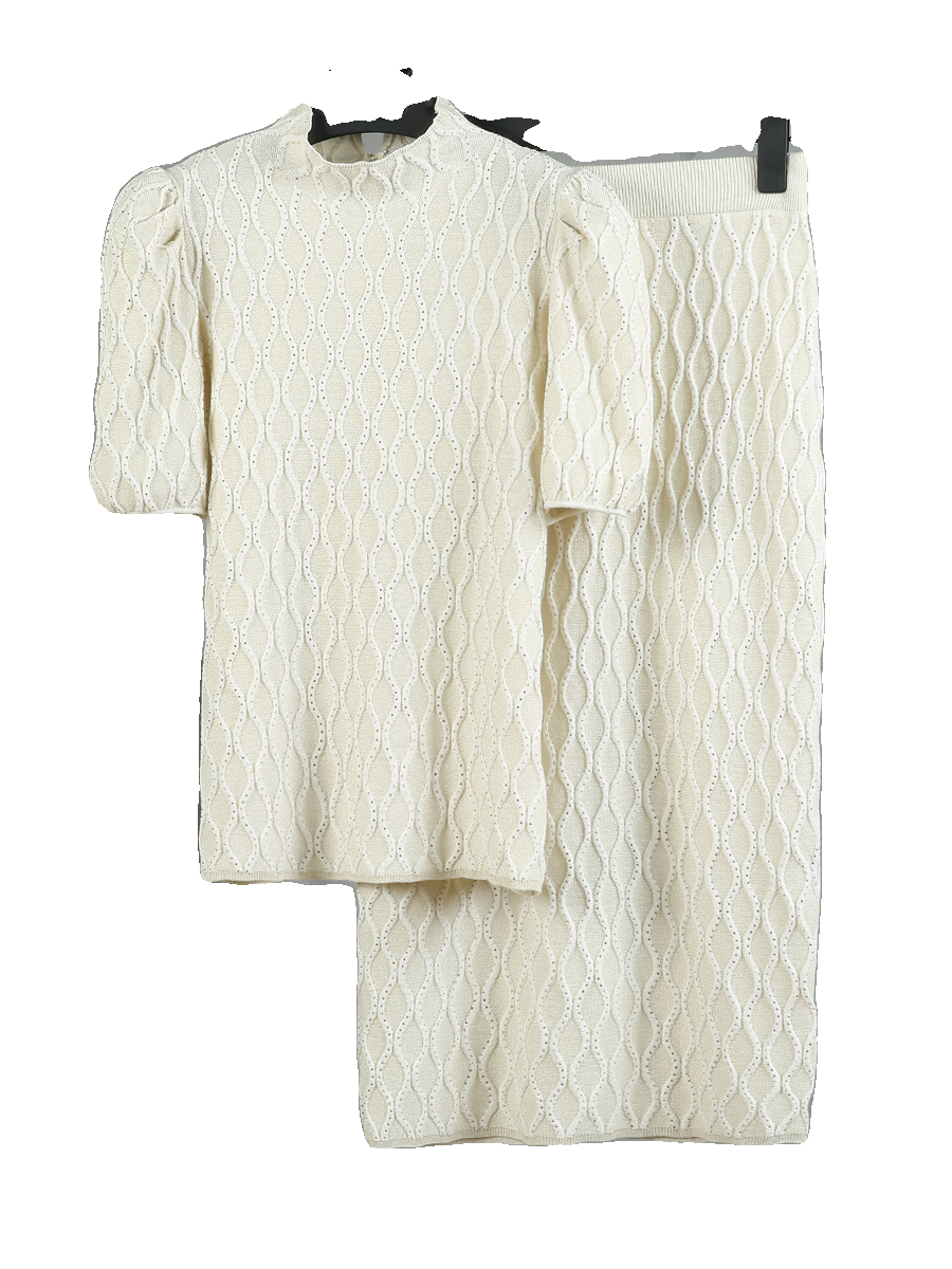 2023秋新品 星悦系列轻奢点钻羊毛针织衫宫廷泡泡袖短袖上衣+半裙 - 诗曼妮针织