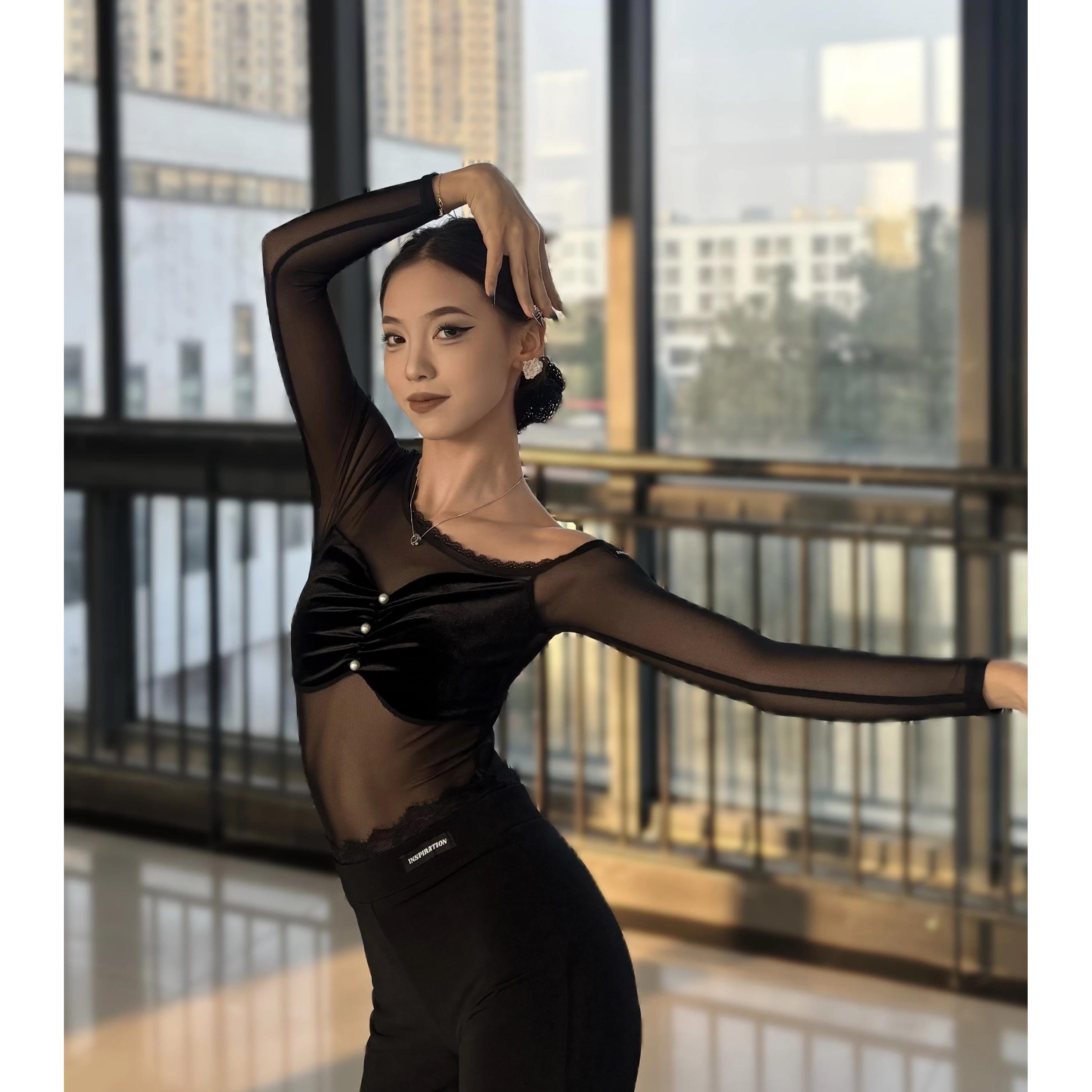 舞月INSPIRATION拉丁摩登款网纱拼接丝绒珍珠长袖带胸垫斜肩显瘦 - 舞月拉丁摩登国标舞总店