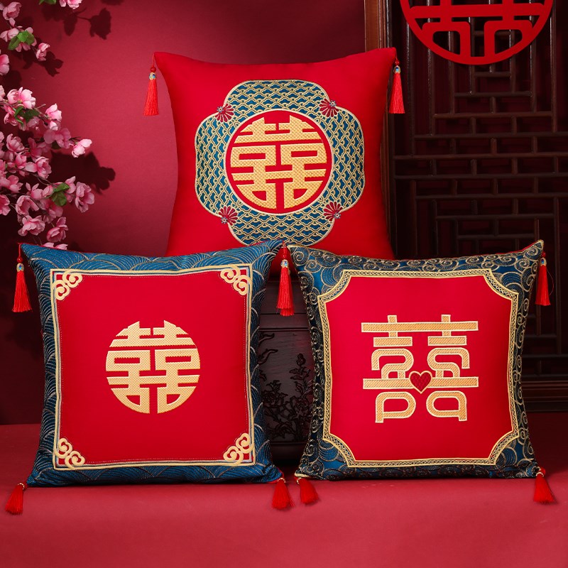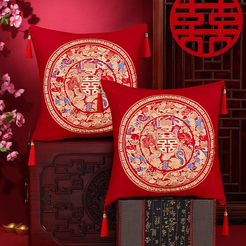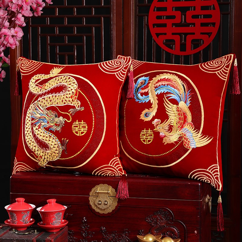 结婚龙凤刺绣抱枕一对婚房客厅沙发靠枕婚礼床头靠垫婚庆用品 - 百菊苑商城
