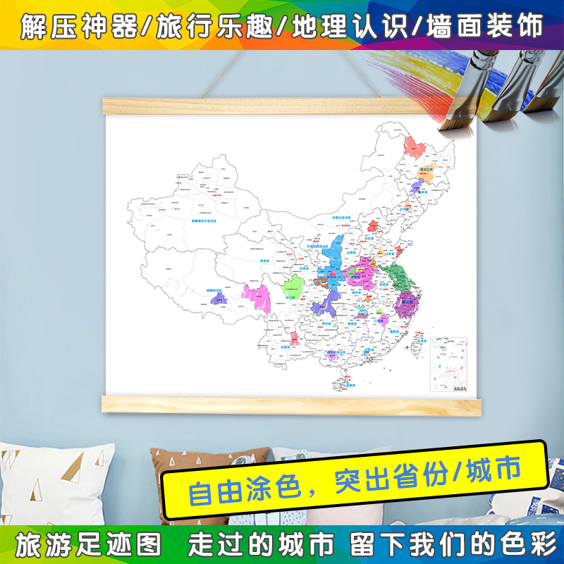 旅行足迹旅游打卡地图各省份手绘地图DIY填色足迹装饰画实木挂轴 - 创彩设计