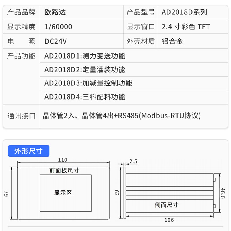 欧路达AD2018D触摸屏称重测力控制仪表RS485/232灌装配料秤MODBUS