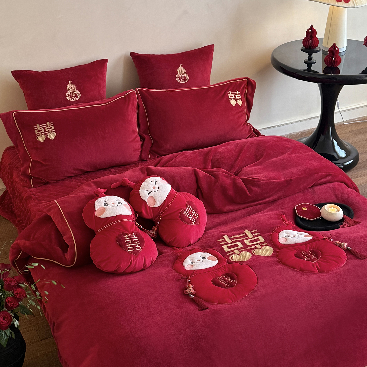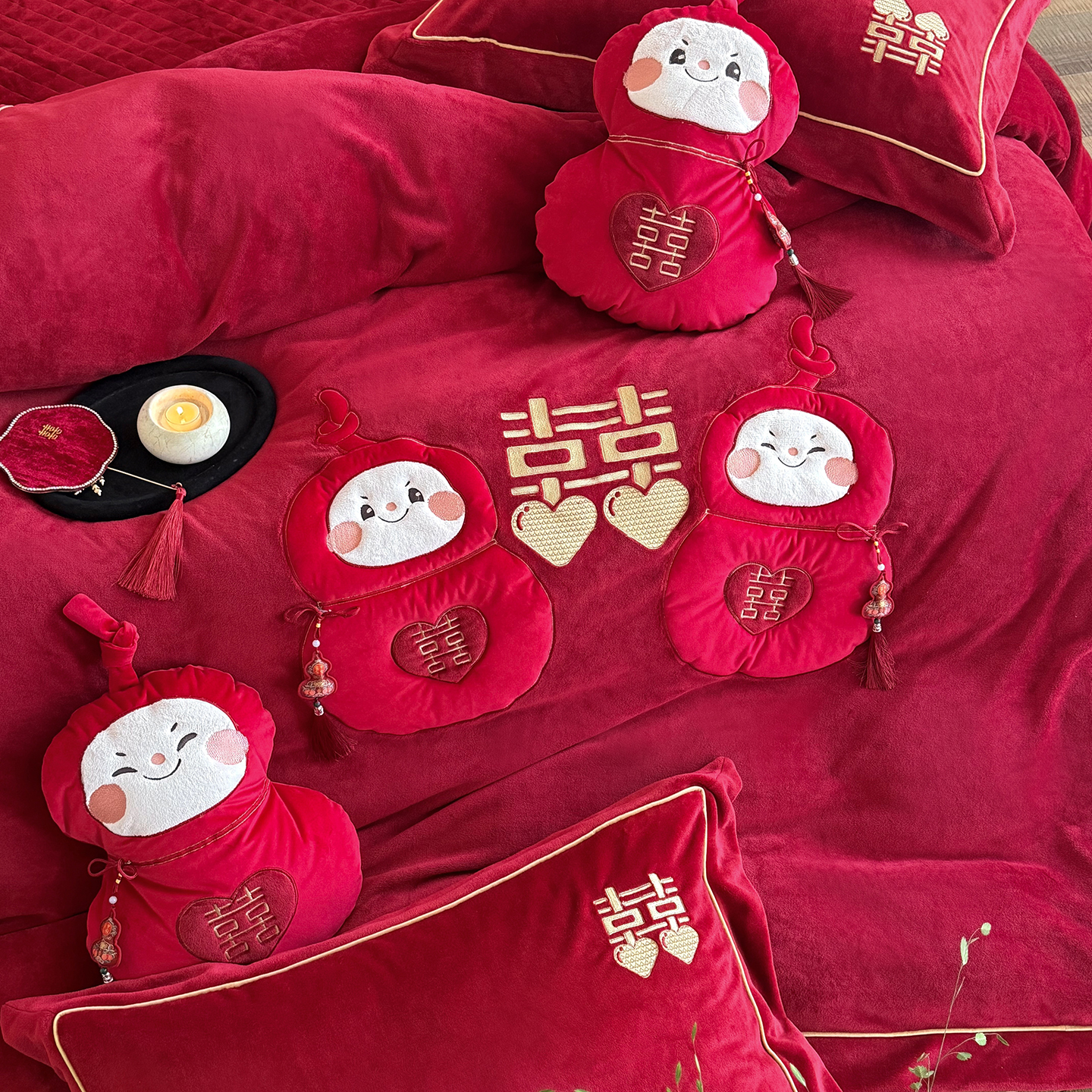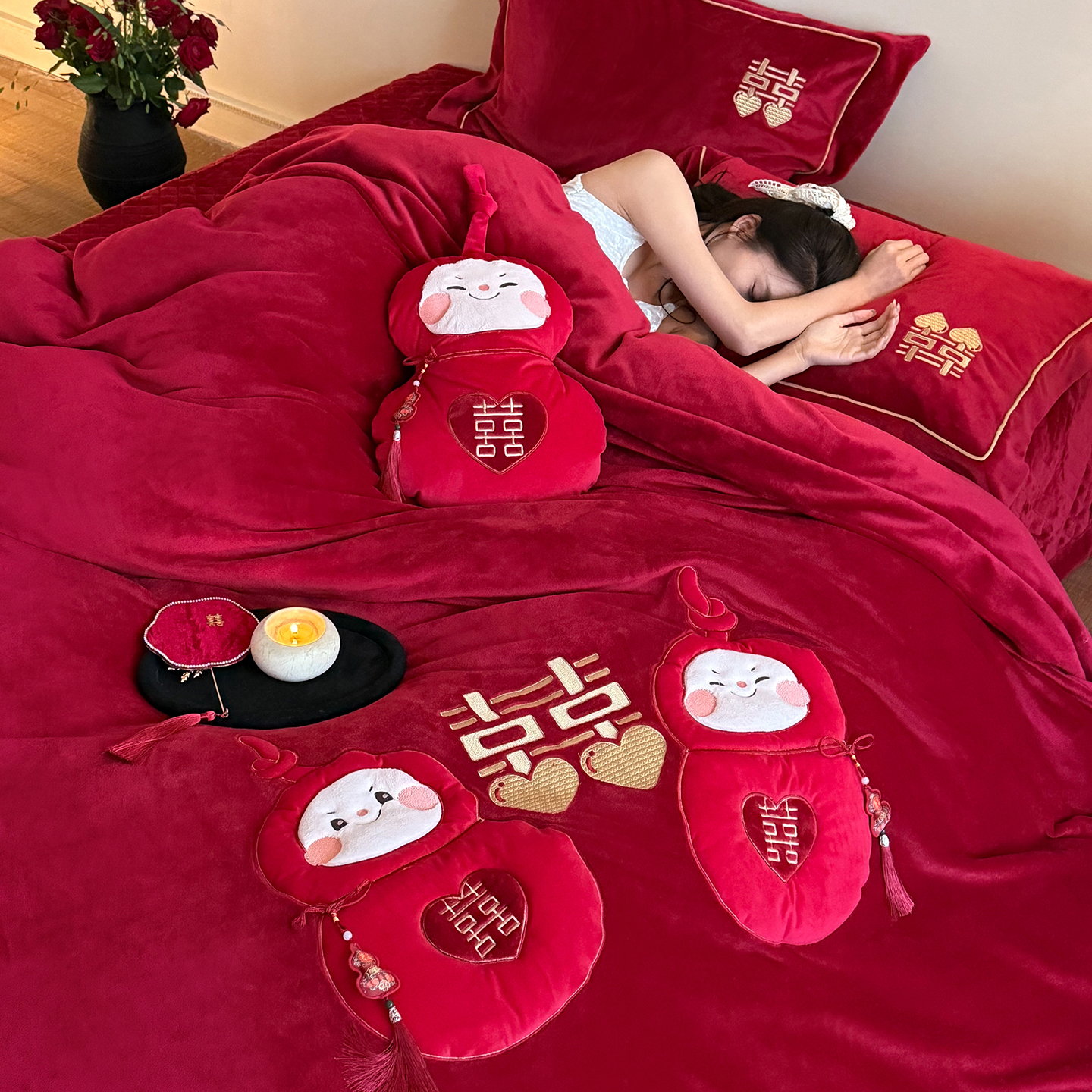 新婚福娃结婚庆牛奶绒四件套冬季刺绣绒喜嫁加厚保暖绒陪嫁娶被套 - 凯尔家纺1企业店