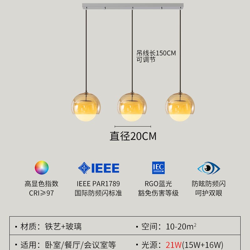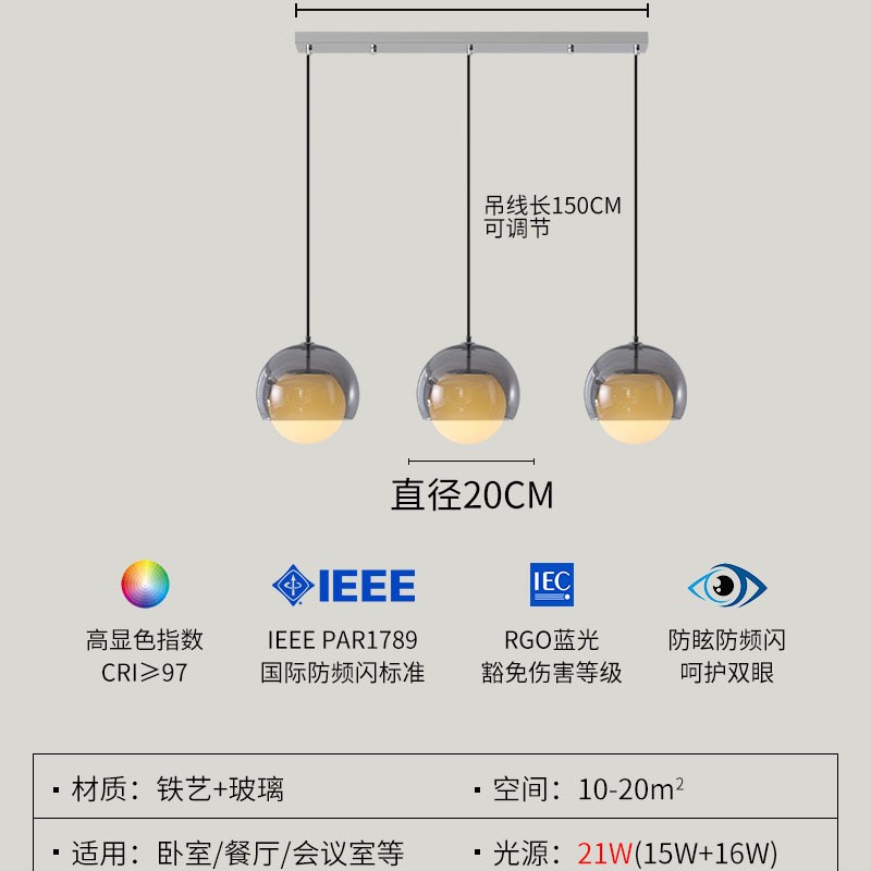 您的位置:他他商城  >   >  欧式设计感卧室床头吊灯轻奢高级玻璃吧台灯3头设计师餐厅灯