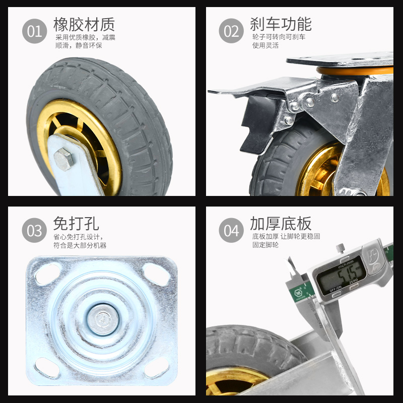 万向轮静音重型橡胶脚轮3寸4寸5寸平板手推车拖车轮子带刹车轱辘 - 圣鑫工厂直销