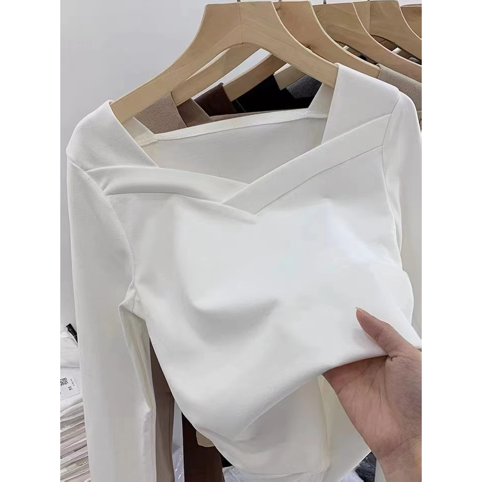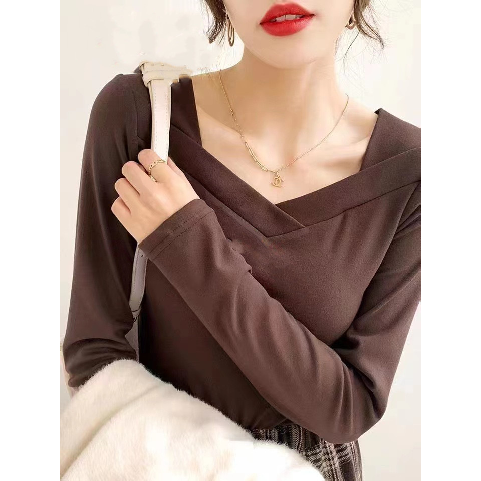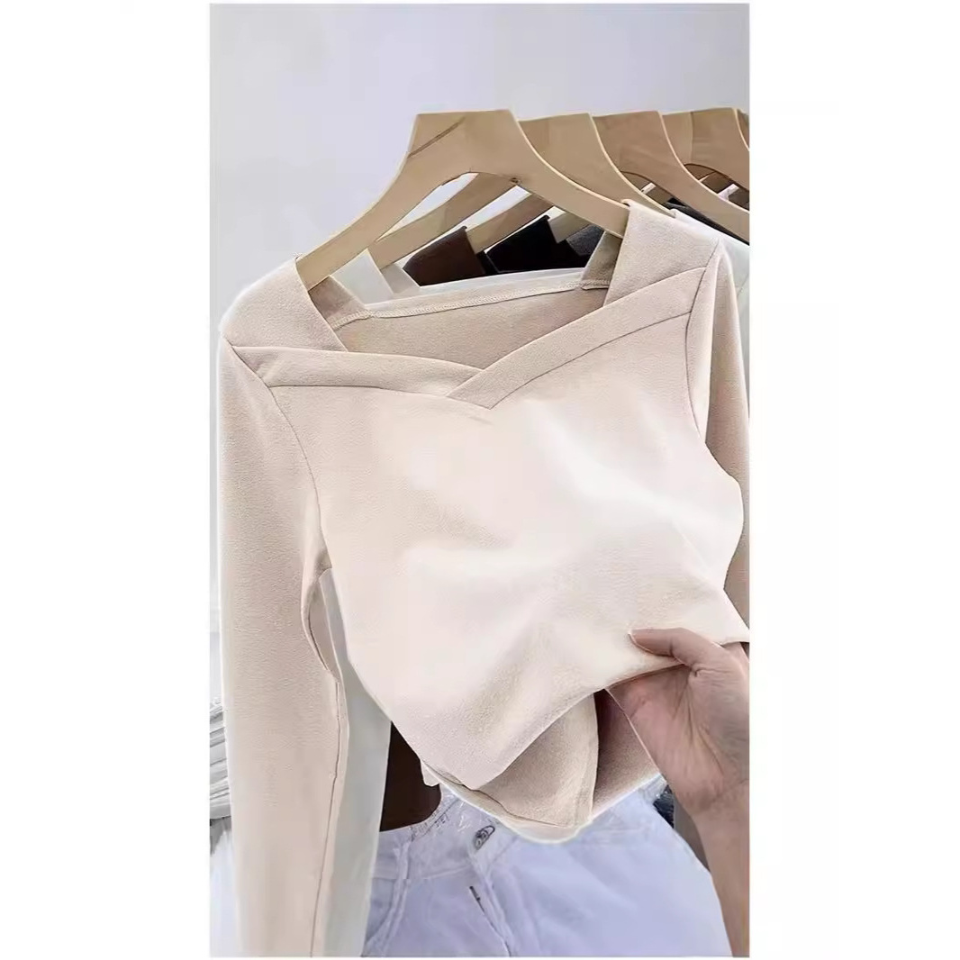 德绒打底衫女装春夏设计感小众V领加绒磨毛洋气修身简约内搭上衣
