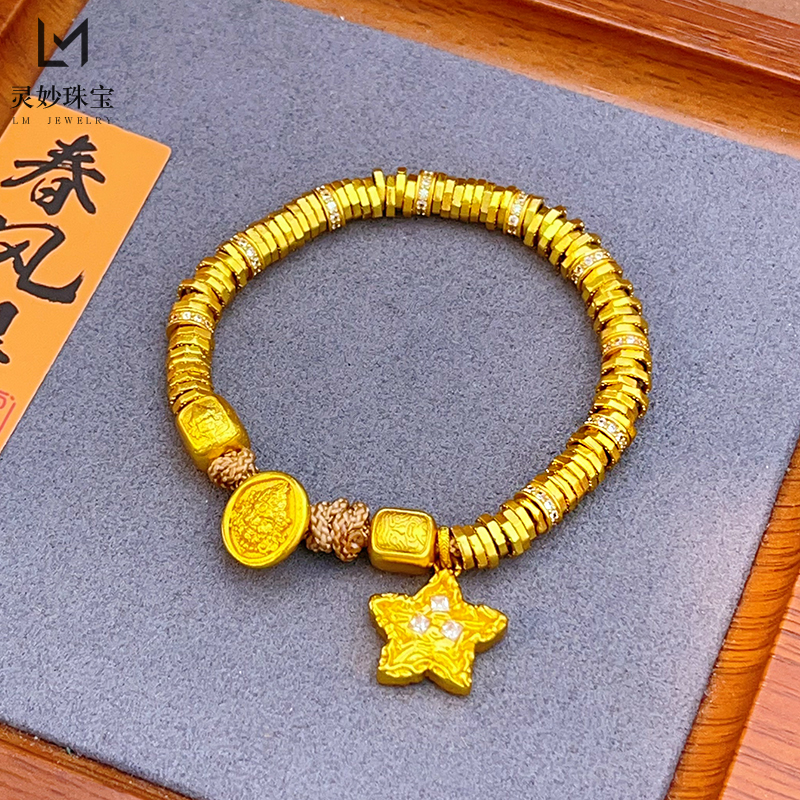 您的位置:他他商城  >  配饰  >  金店同款沙金999点钻锤纹星星黄财神盘缠钱串子手链男女藏式手绳