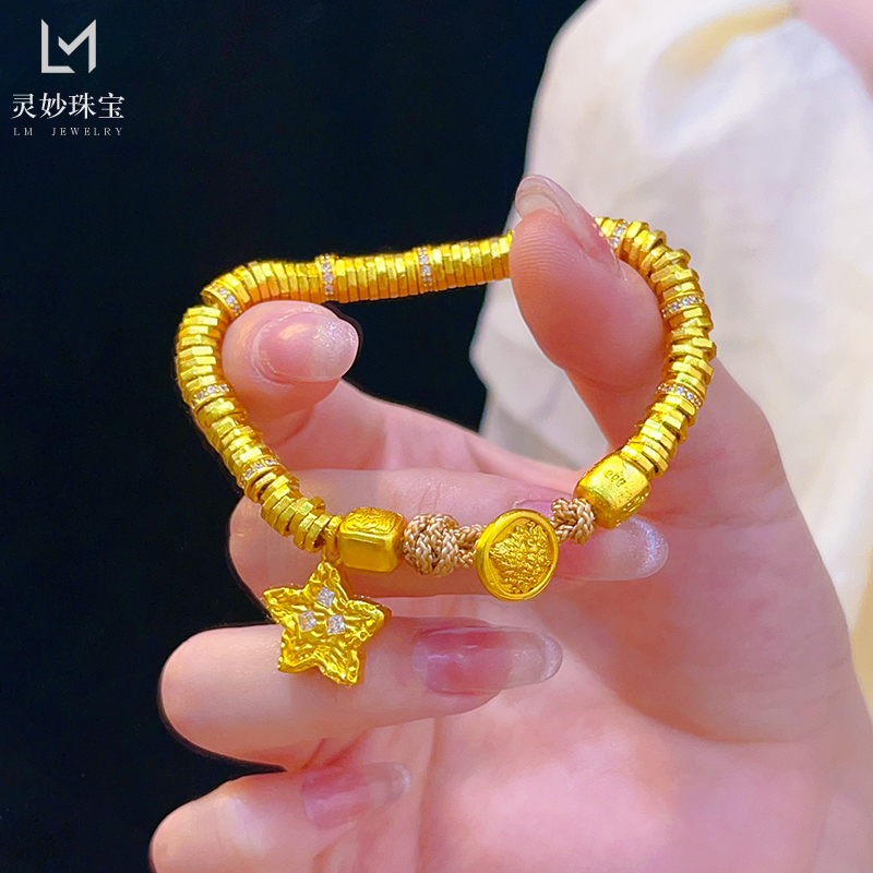 金店同款沙金999点钻锤纹星星黄财神盘缠钱串子手链男女藏式手绳 - 灵妙水晶珠宝