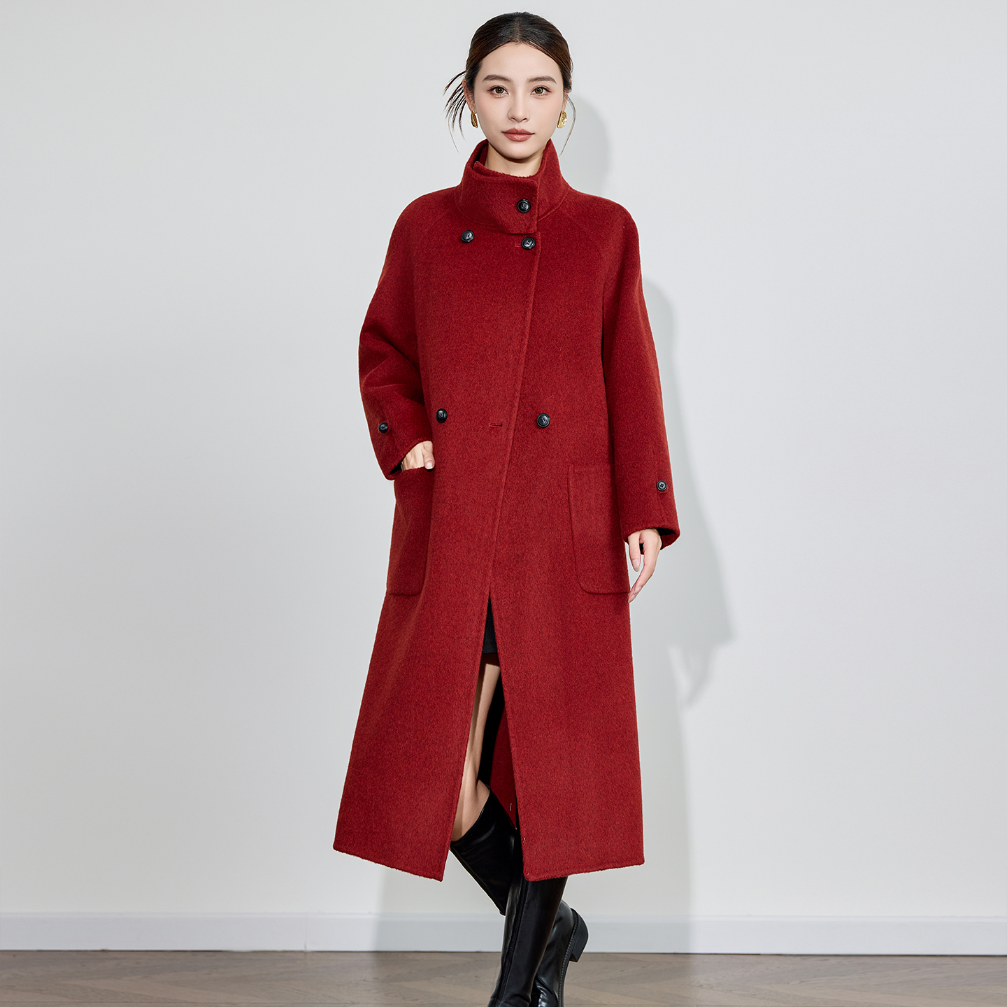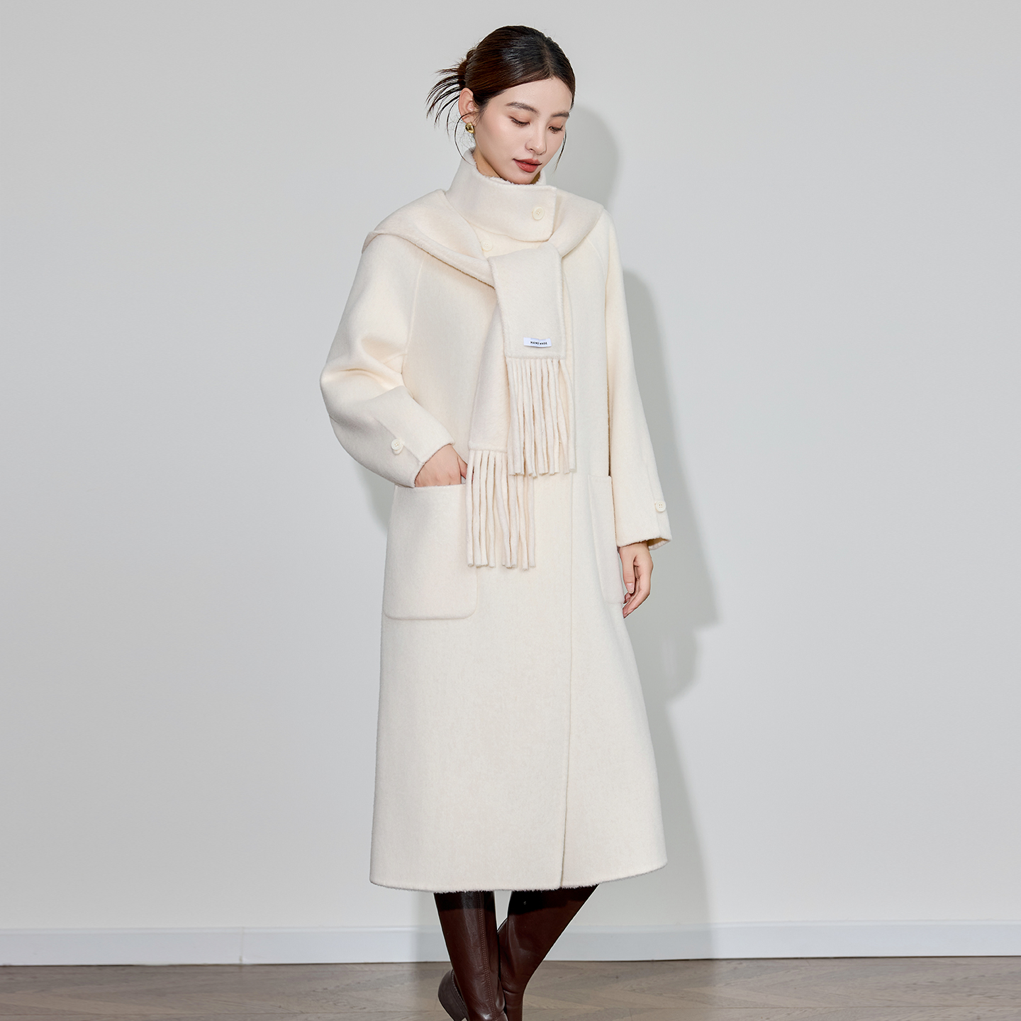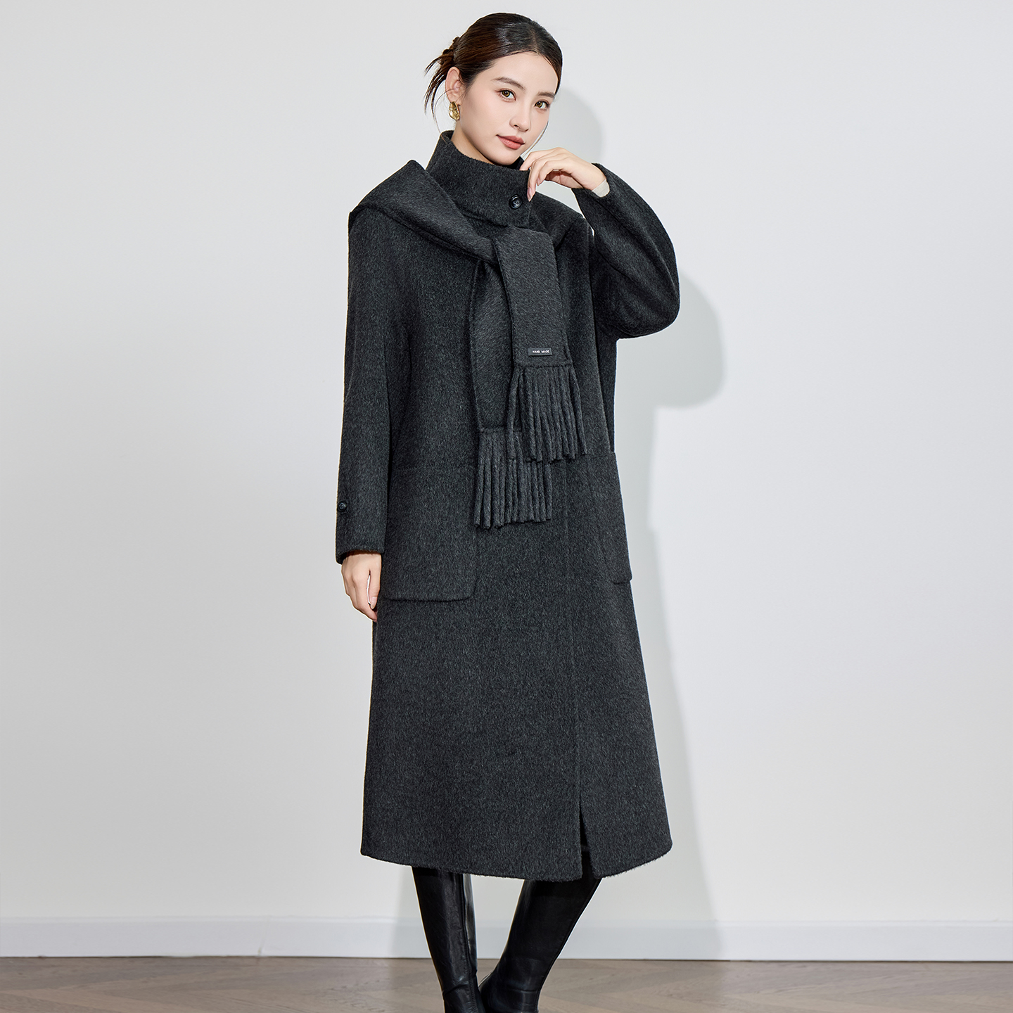 双面羊绒大衣女中长款25秋冬新款立领可拆卸连帽围巾保暖毛呢外套 - 言絮高端女装
