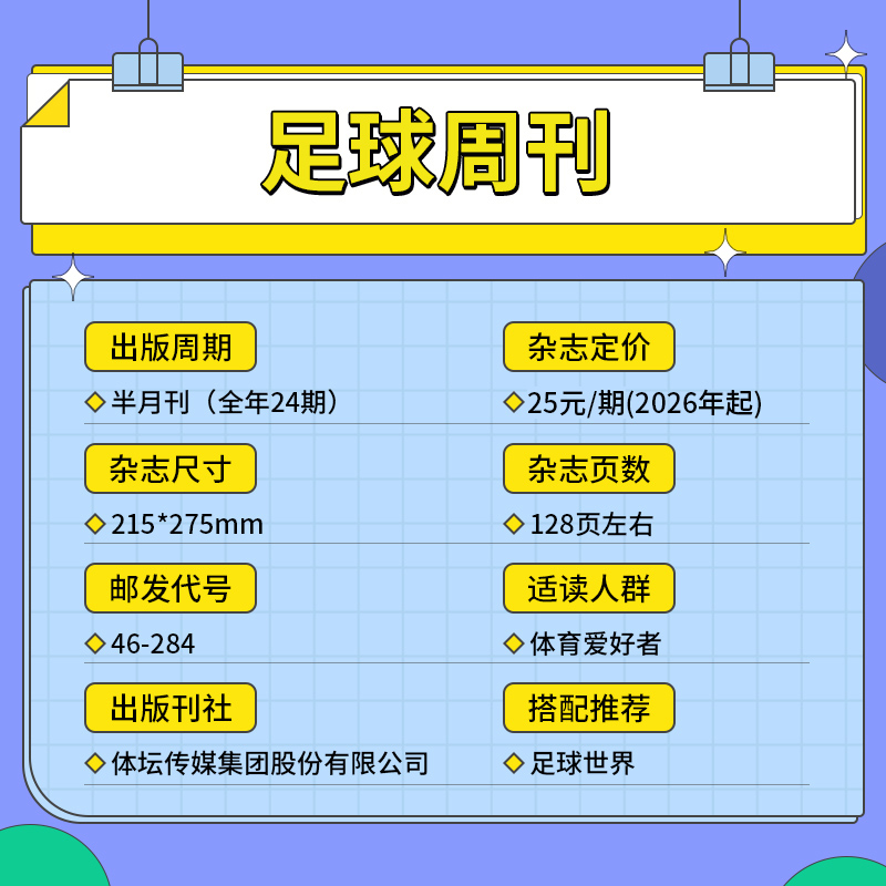 【全年订阅】足球周刊杂志2026年1月起订 预定全年总24期 起订月可改 每月一发(不含每年的足球周刊的增刊) - 商界旗舰店
