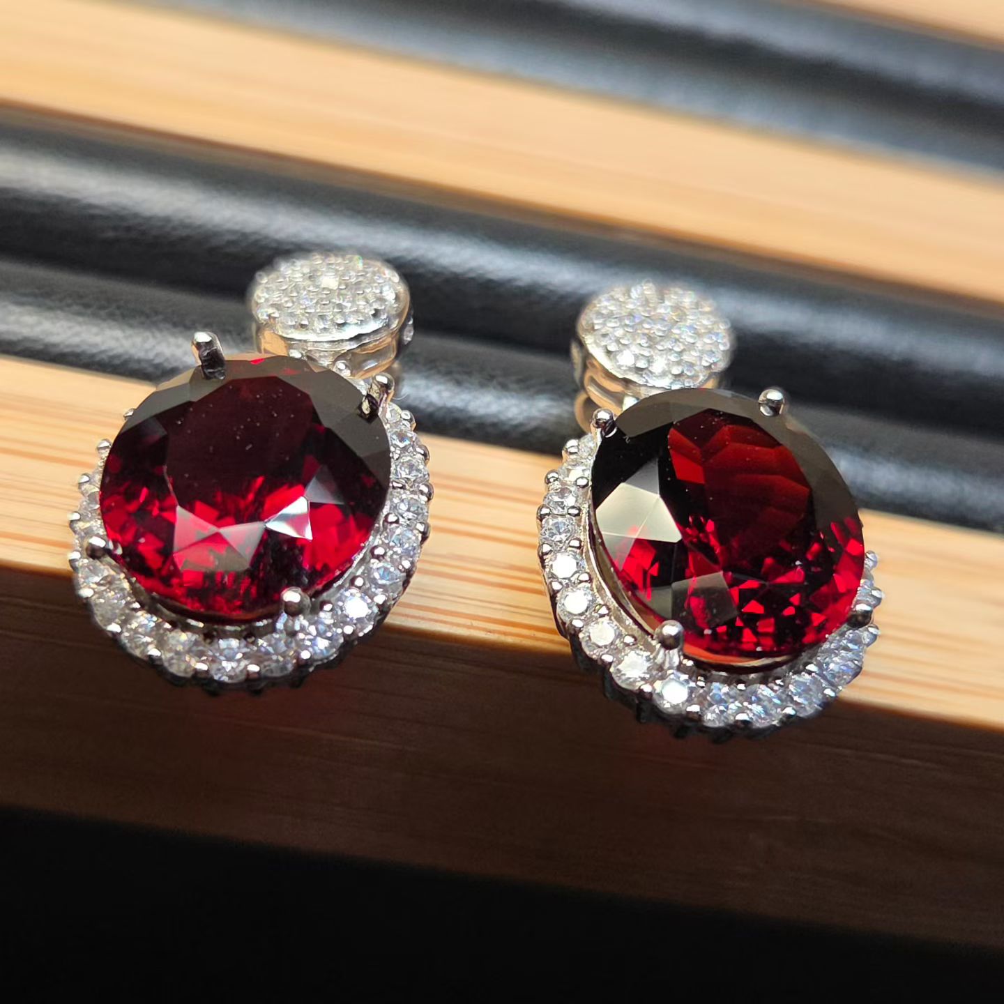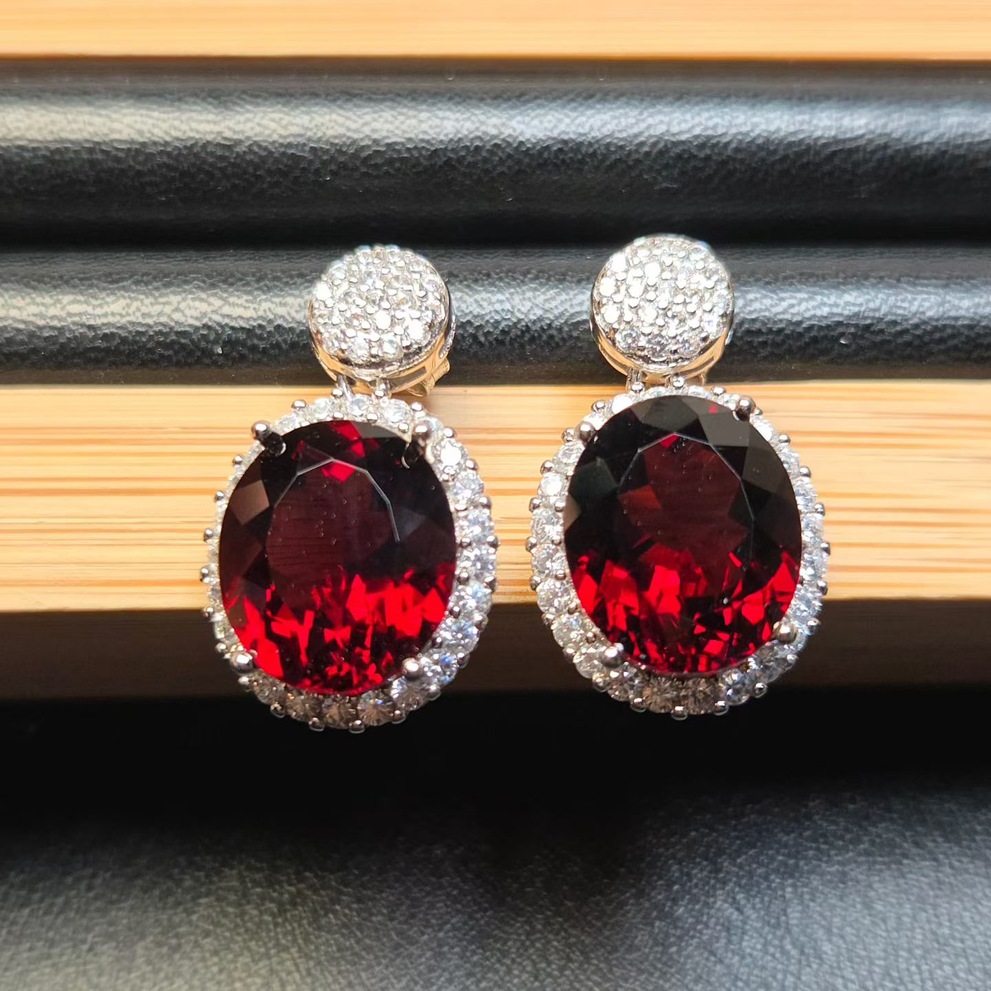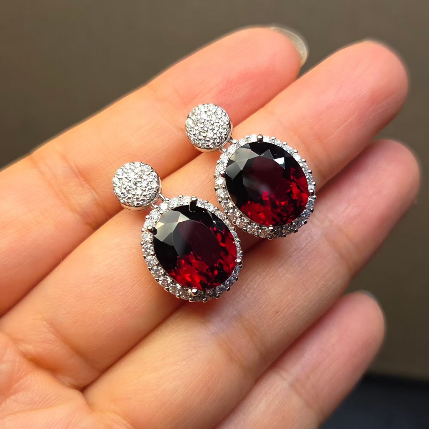 天然鸽血红色石榴石耳坠大克拉鸽血红重量13.8克拉全净体925银镶 - 墨兰彩宝戒面成品批发