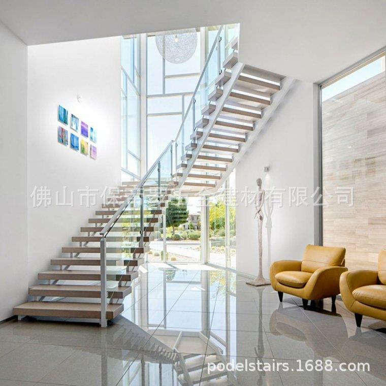 室内 家用 钢木U型 旋转楼梯现代简约风单梁钢管玻璃护栏
