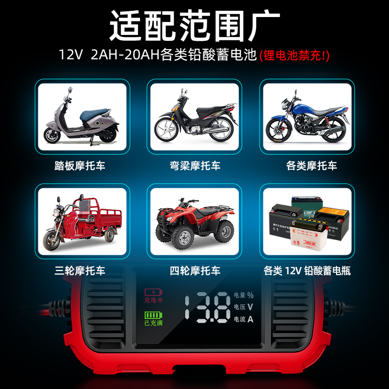 您的位置:他他商城  >  文体  >  徽农摩托车电瓶充电器12v伏踏板铅酸蓄电池自动通用全智能充电机