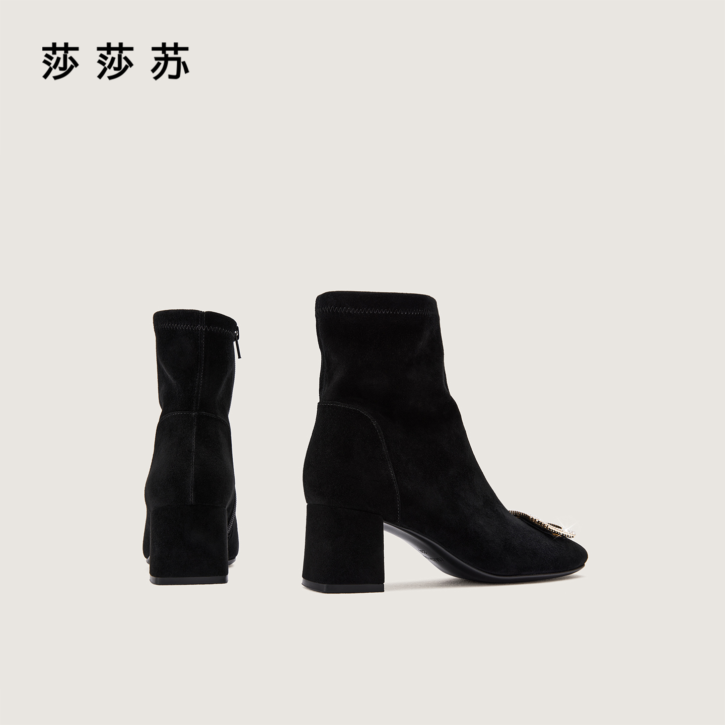 [方糖钻]莎莎苏2025秋冬新款方头气质高跟靴黑色百搭羊绒切尔西靴 - 莎莎苏官方旗舰店