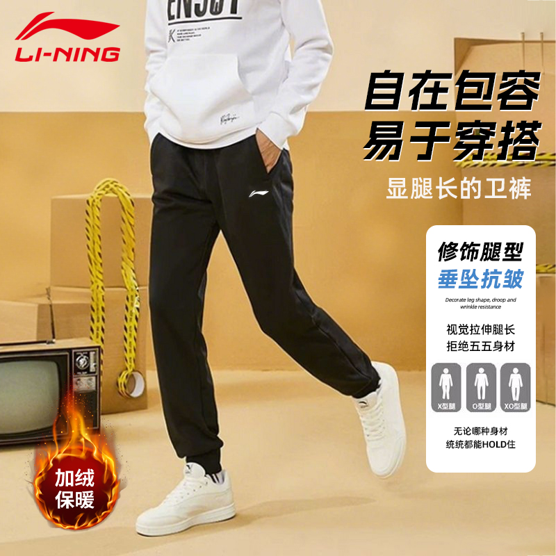 李宁运动加绒裤男士2025新款冬季加厚束脚卫裤保暖男款长裤子防寒