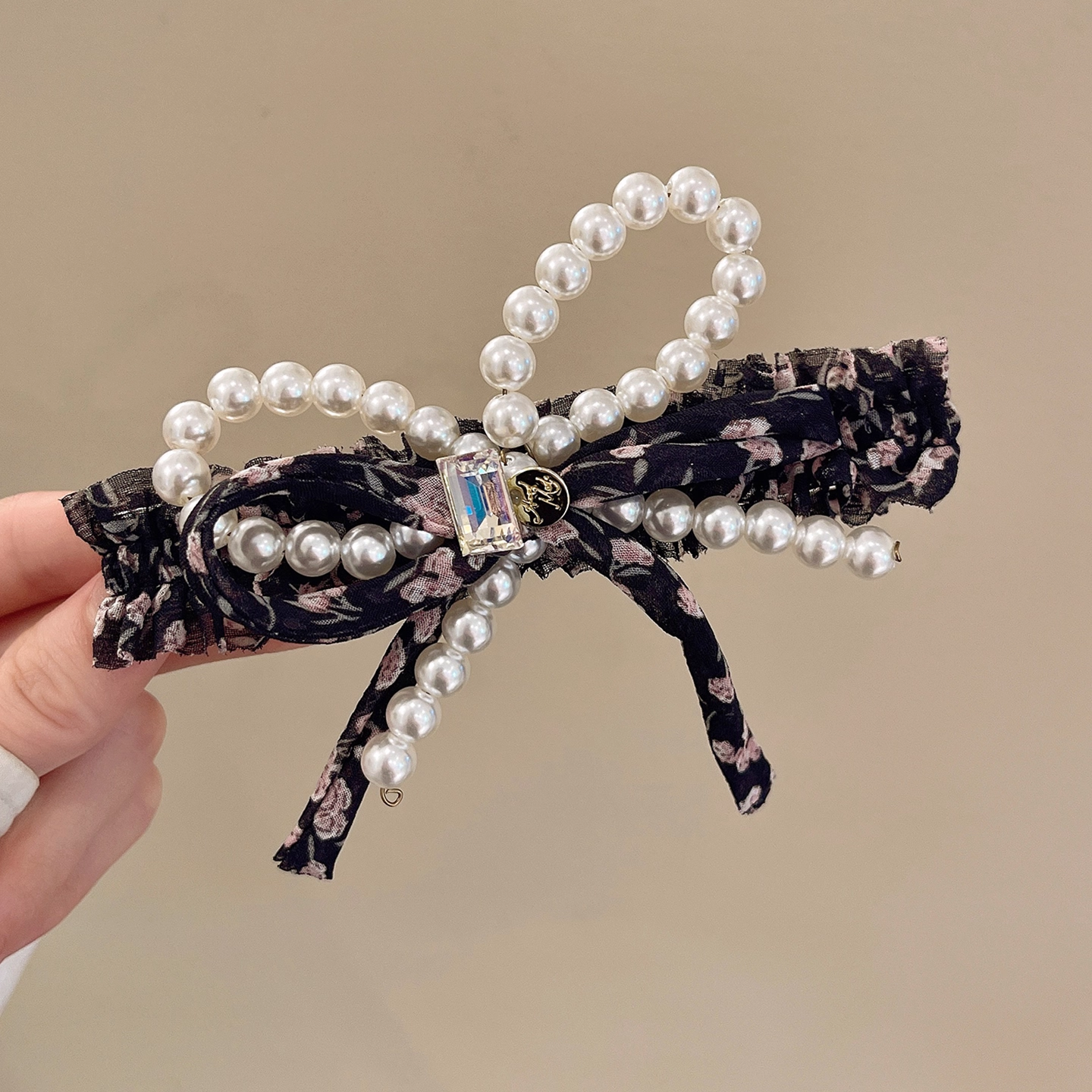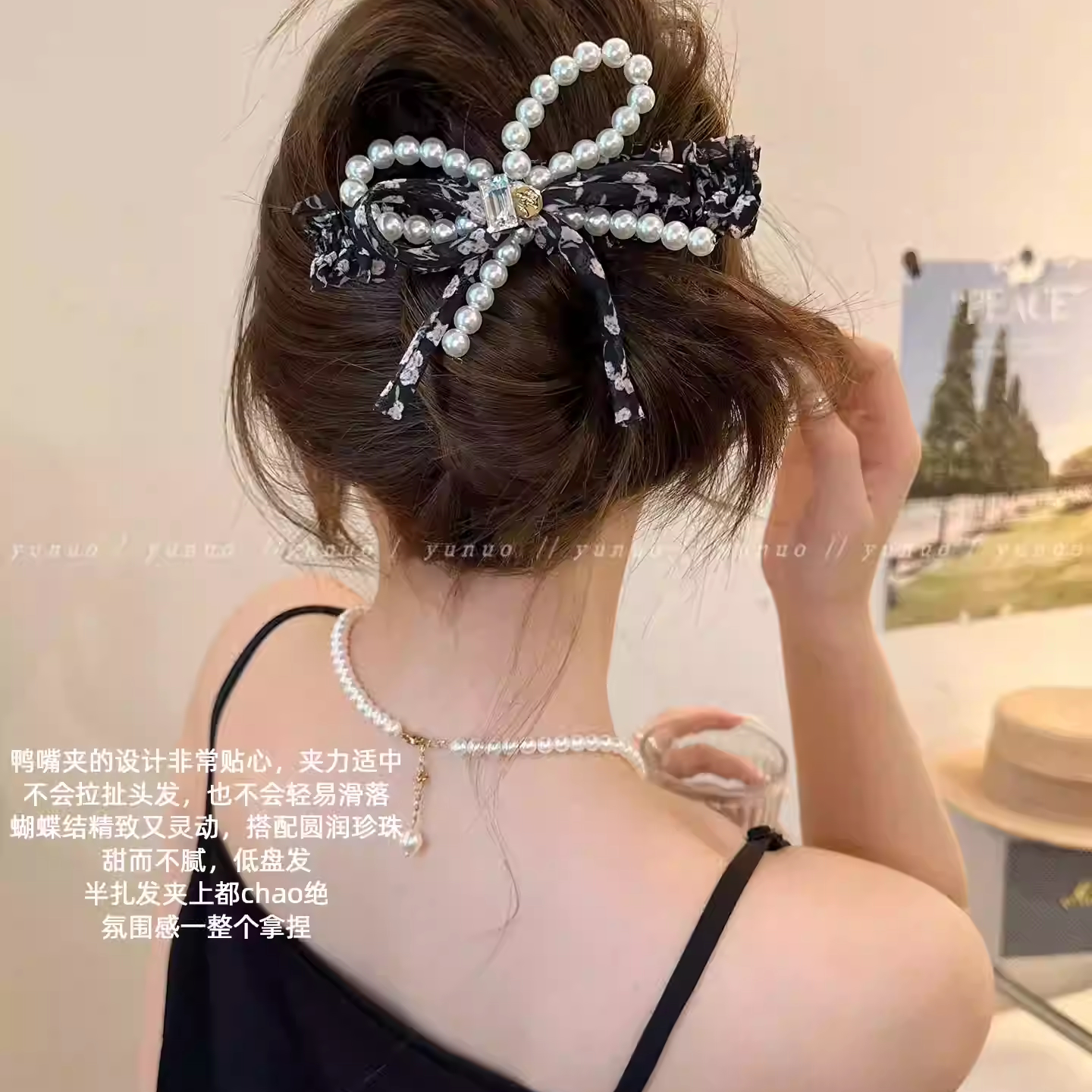 法式气质珍珠蝴蝶结发夹女后脑勺高级感盘发鸭嘴夹子大号一字抓夹 - 花开遍野