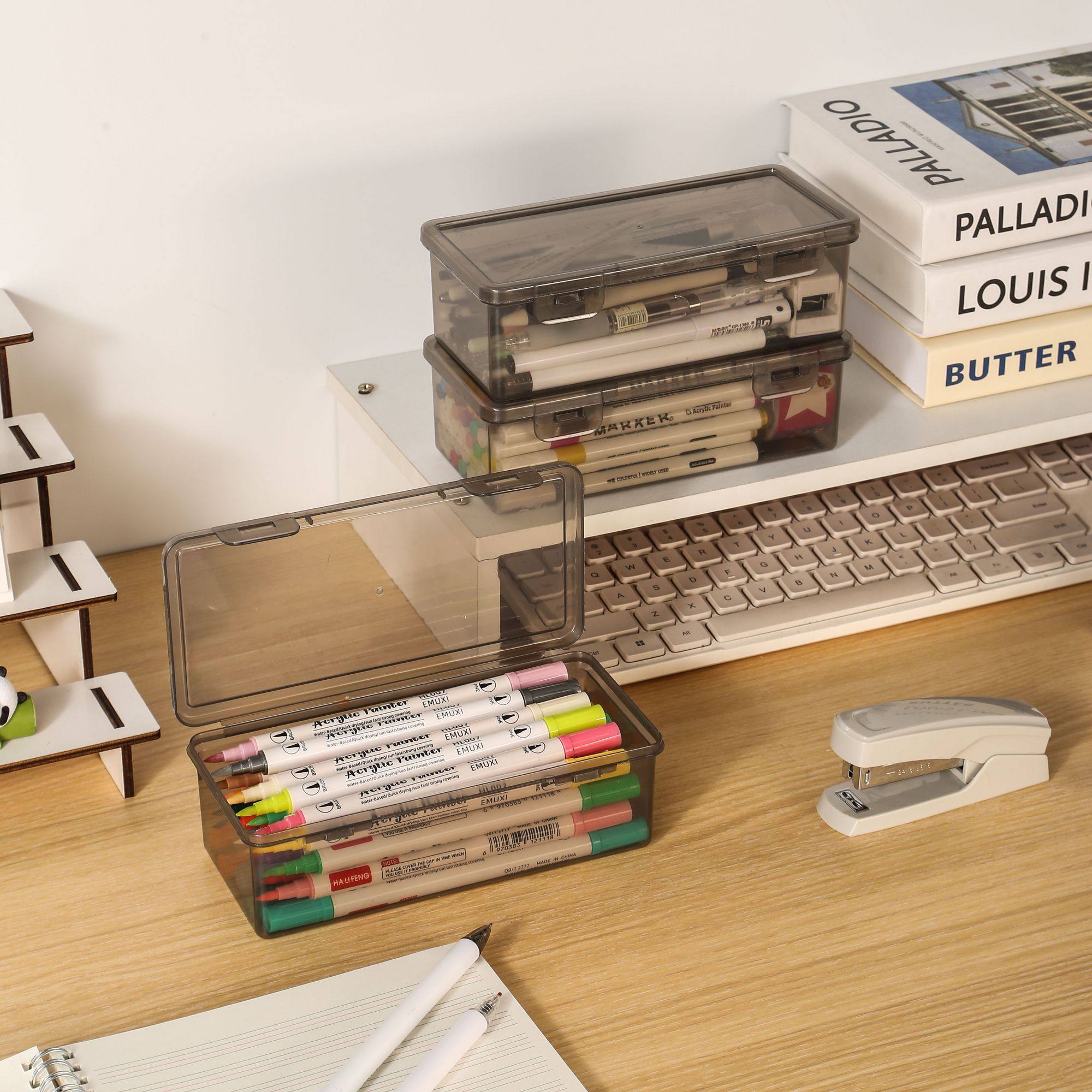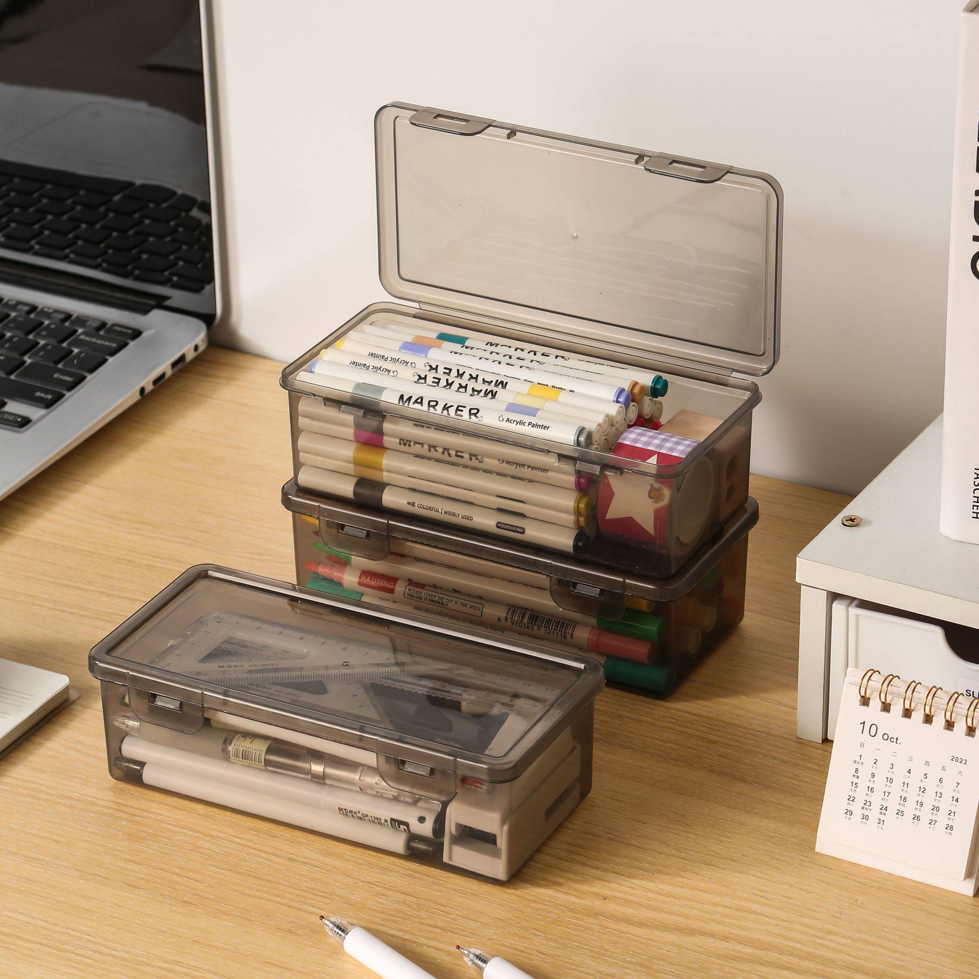 简约桌面透明笔盒学生马克笔水彩笔带盖铅笔画收纳盒大容量加厚 - 淘百货二元店