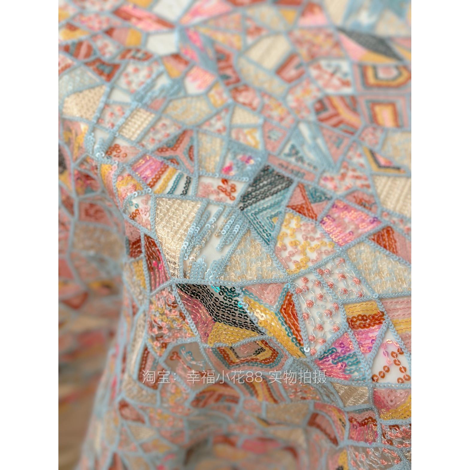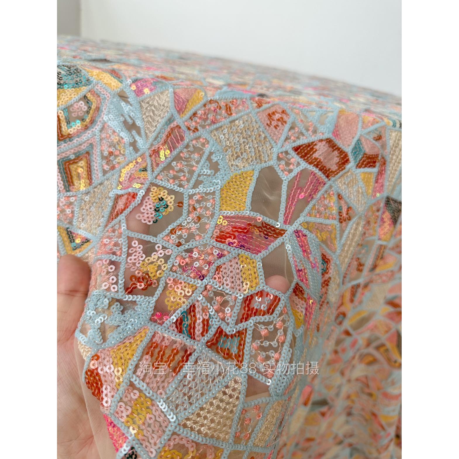 S15重工色织几何图形菱形立体亮片绣花软网纱布料服装旗袍面料 - 四尊百货官营店