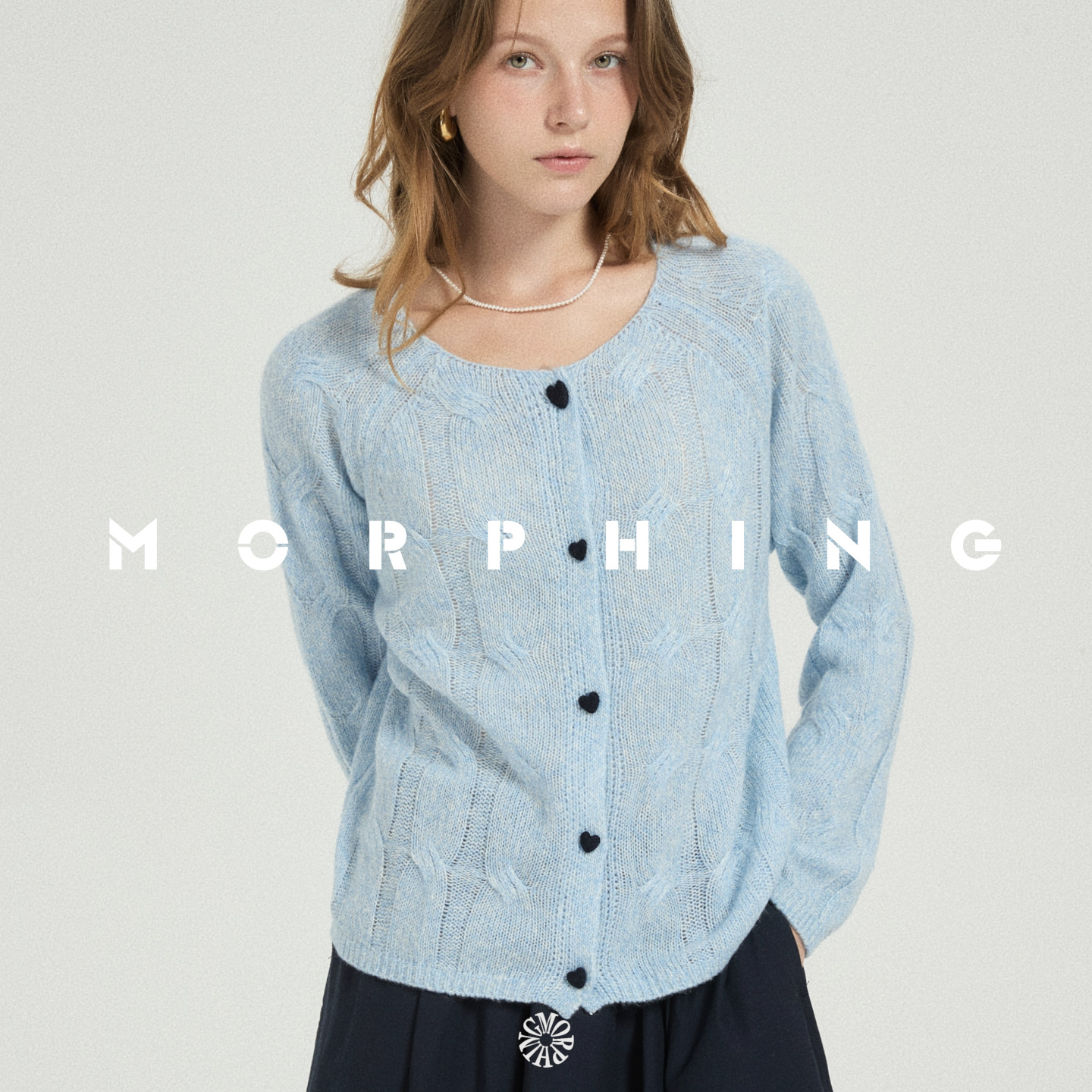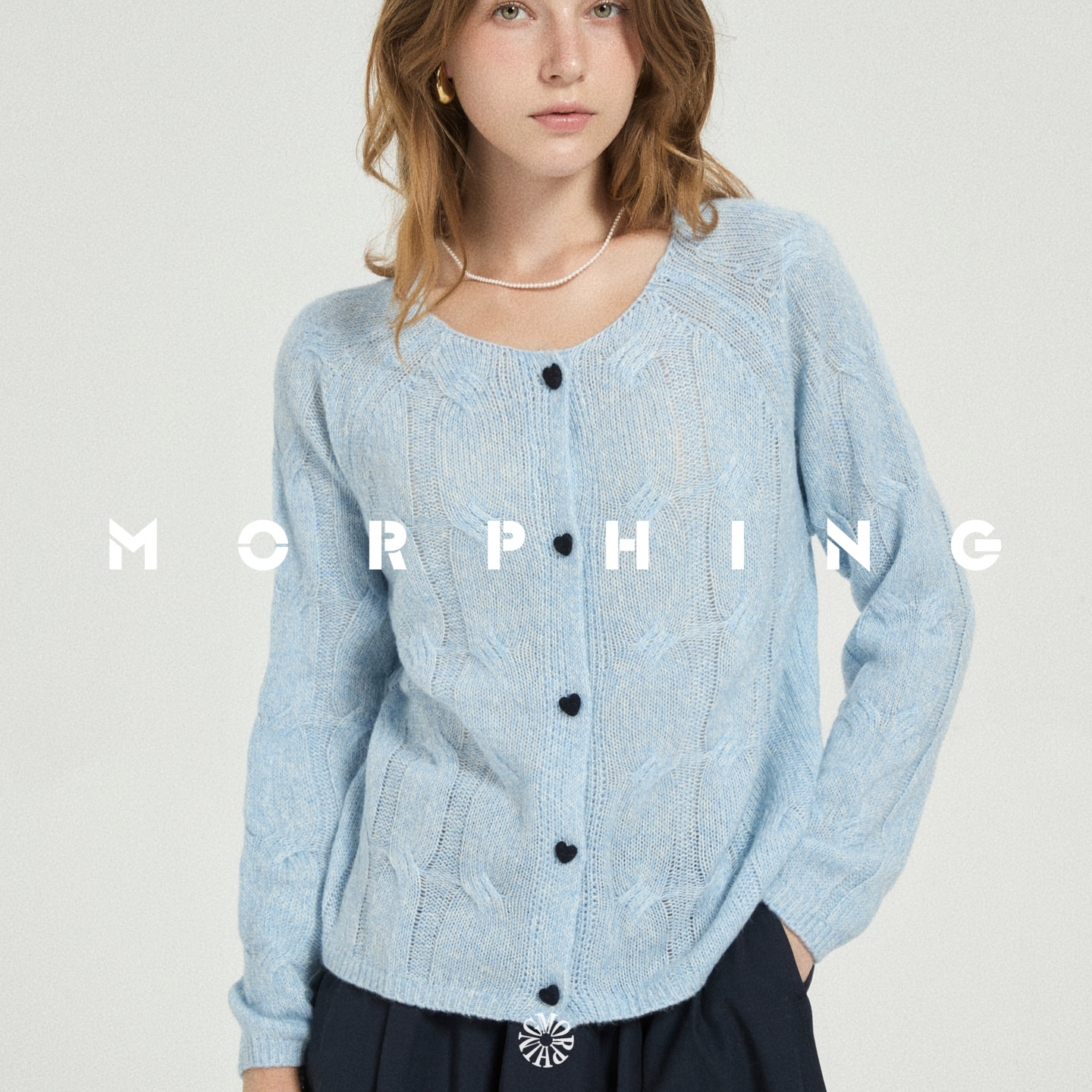 茉斐MORPHING定染山羊绒绵羊毛混纺圆领宽松插肩袖撞色爱心扣毛衣
