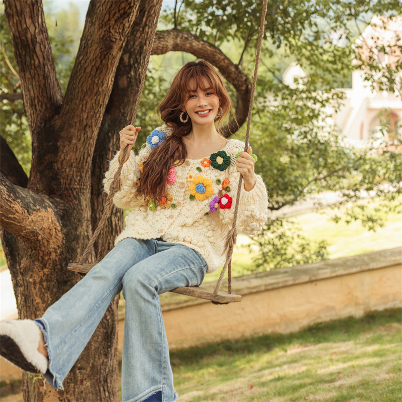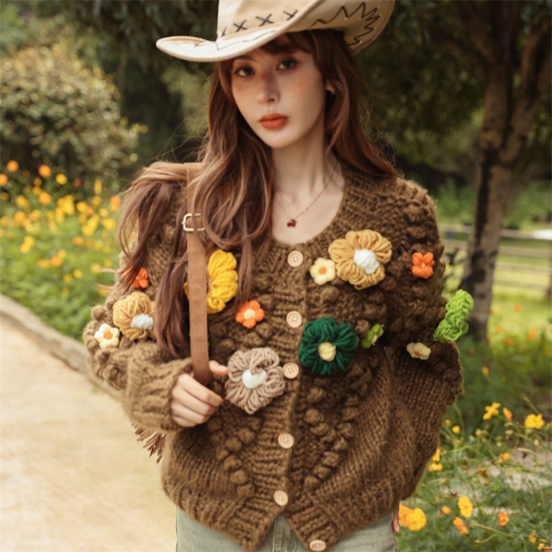 CLOUDSEASON彩色花花手打毛衣女2025春秋新款小个子宽松慵懒外套 - cloudseason旗舰店