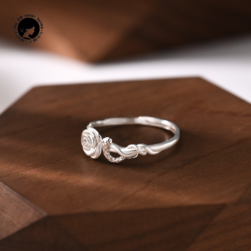「惊蛰」玫瑰与蛇 S999足银灵蛇玫瑰戒指女小众设计通勤纯银指环 - 有你的二十四节气银饰