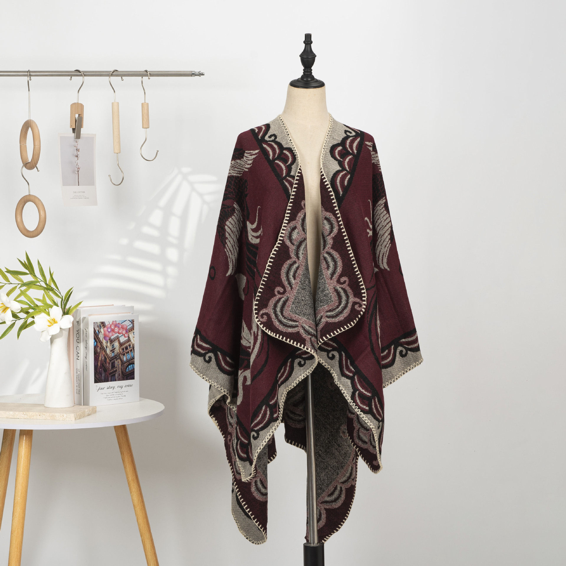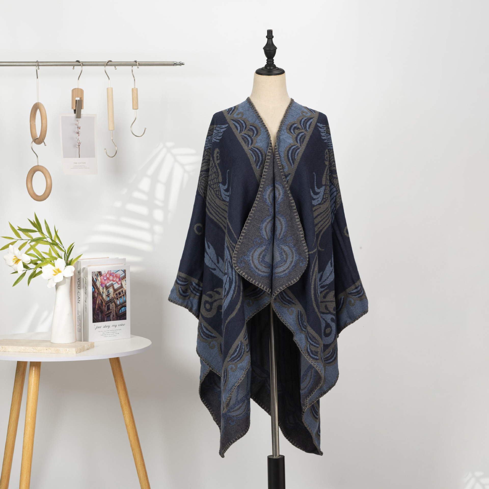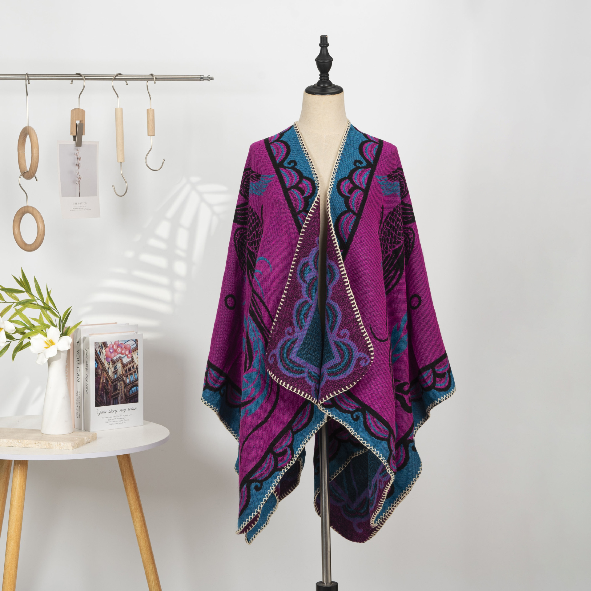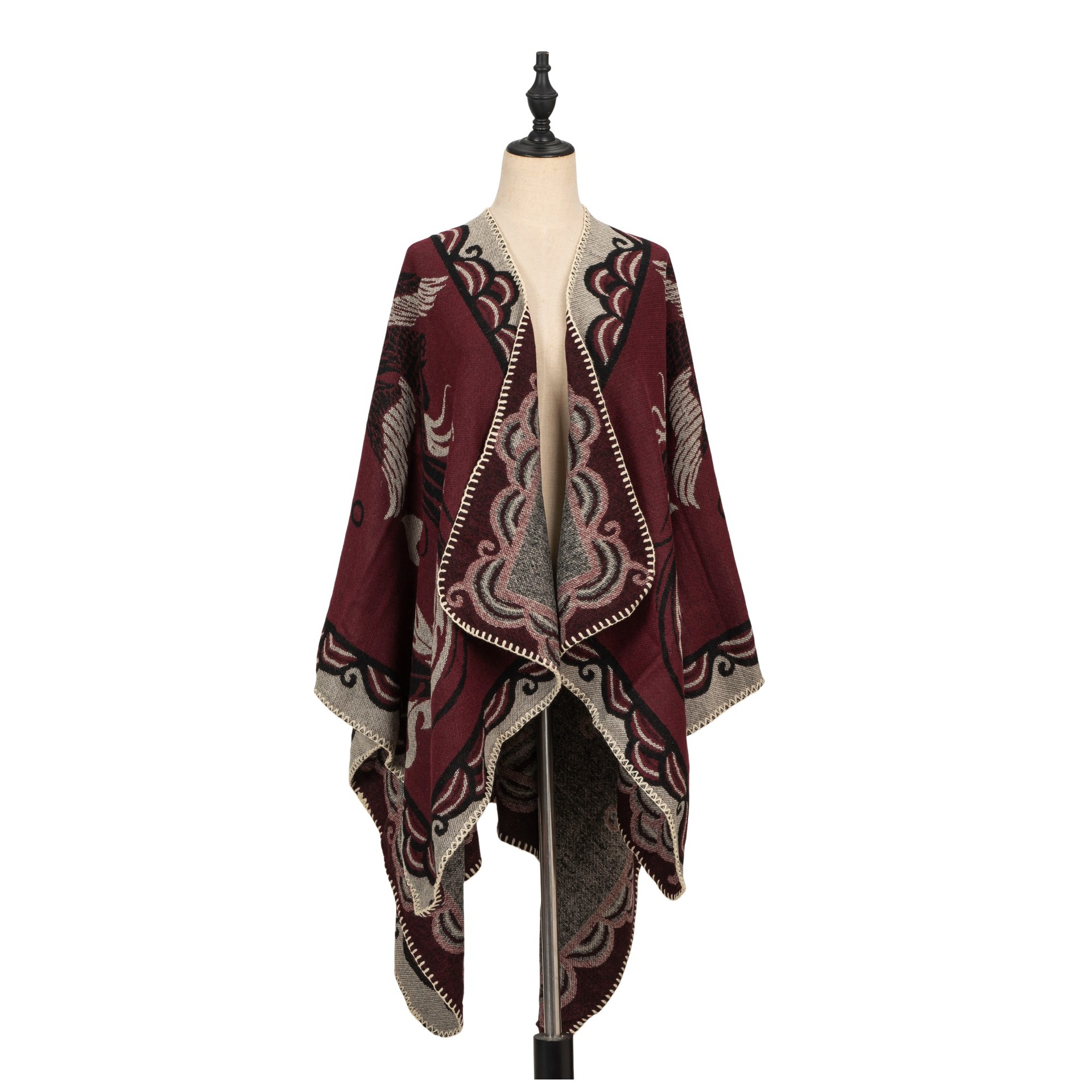 您的位置:他他商城  >   >  雅韵新品中式复古仿羊绒披肩女刺绣提花斗篷式针织开衫两穿式