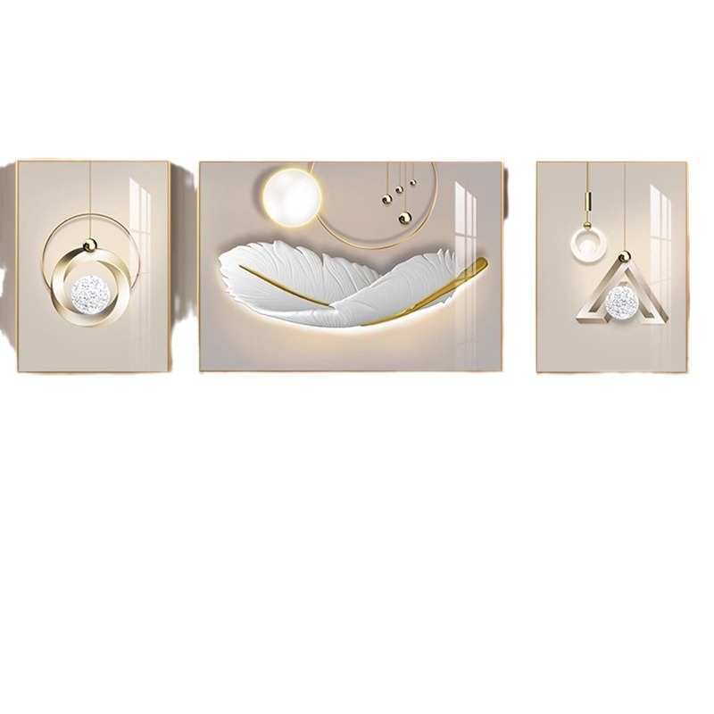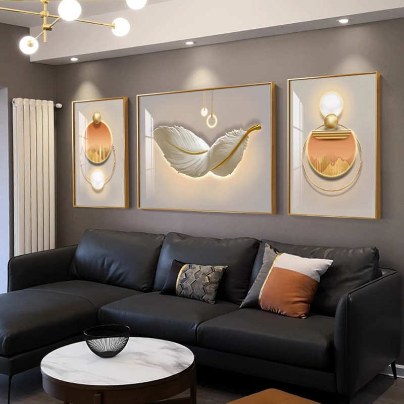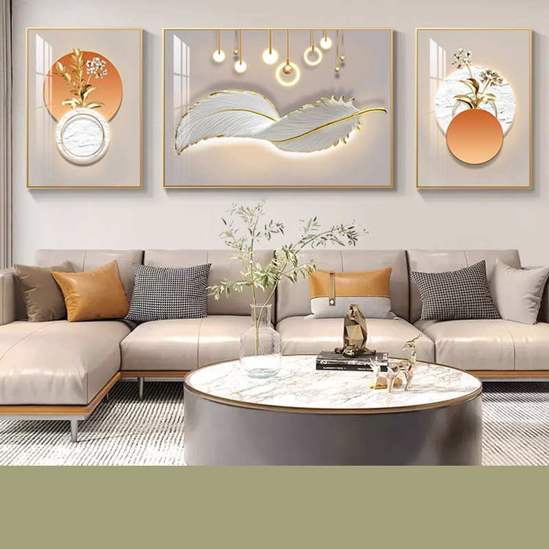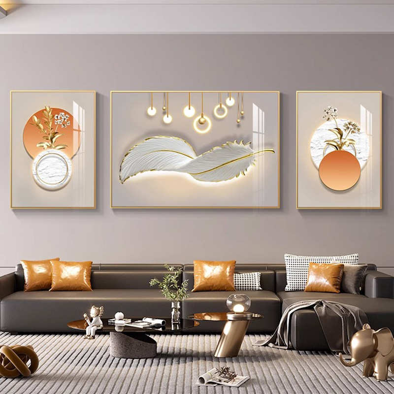 轻奢金羽呈祥客厅装饰画现代简约抽象三联羽毛壁画沙发背景墙挂画