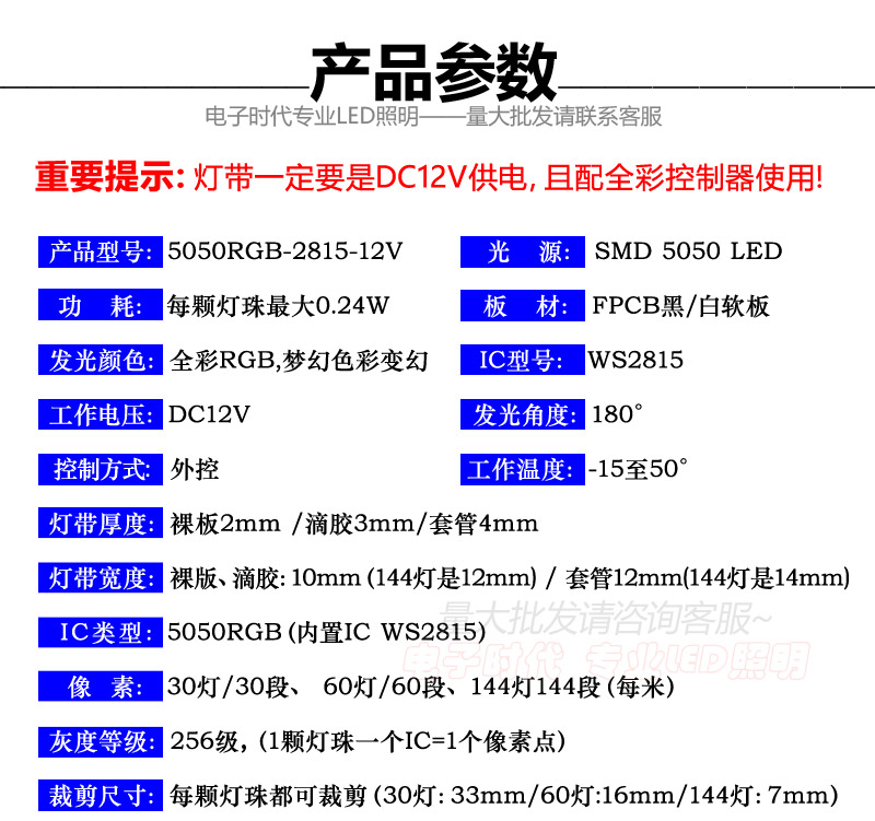WS2815幻彩LED灯条12V内置IC断点续传5050RGB全彩软灯带单点单控 - 电子时代商城