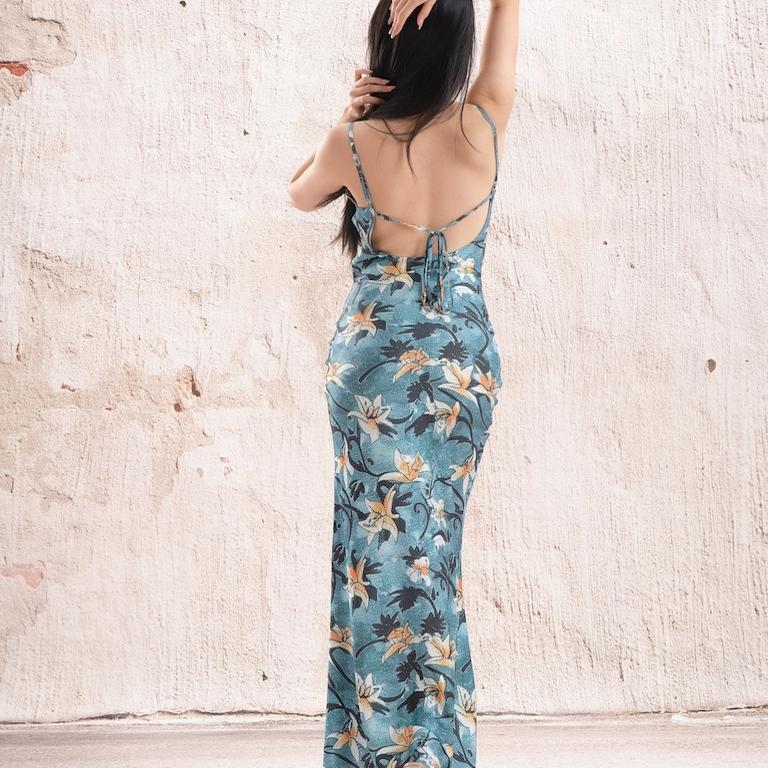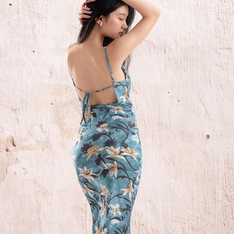 FlowerinMood|「热带鱼尾」 海边度假风湖绿露背吊带印花连衣裙 - FlowerinMood 花予木