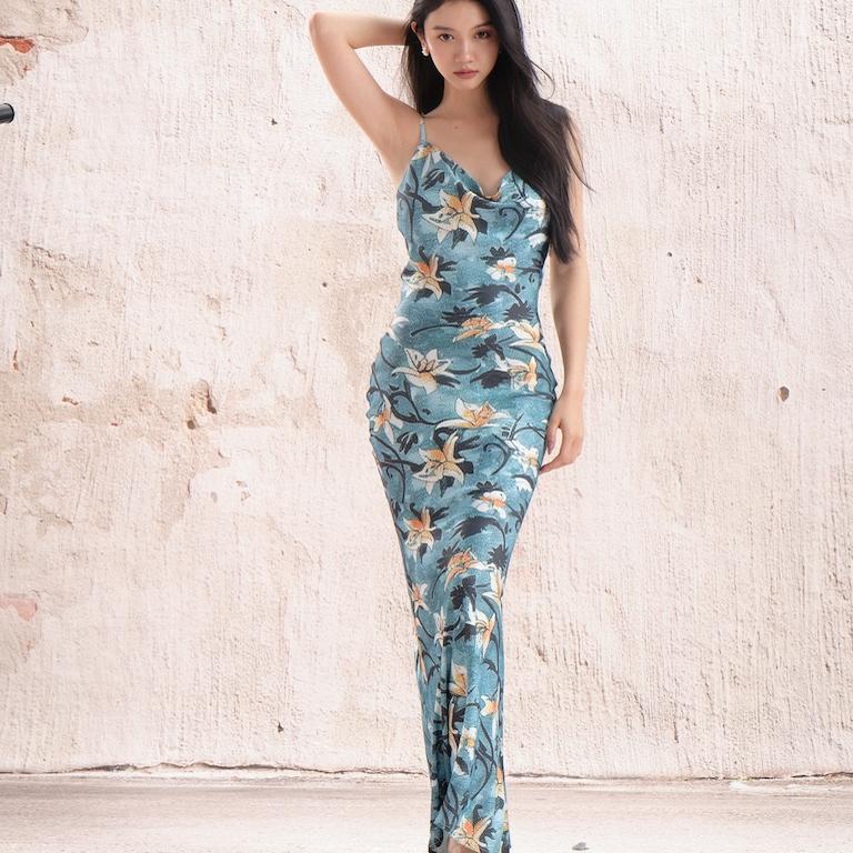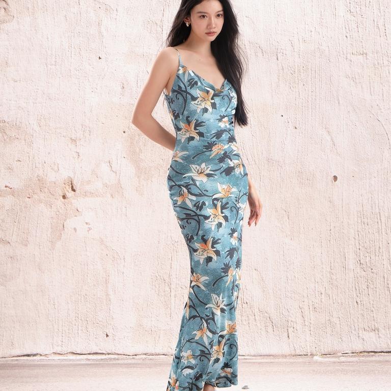 FlowerinMood|「热带鱼尾」 海边度假风湖绿露背吊带印花连衣裙