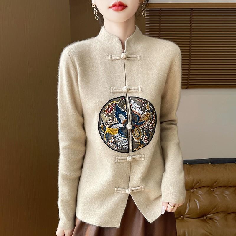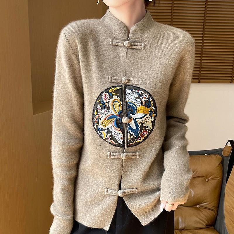 新中式国风100%纯羊毛开衫女立领盘扣刺绣针织外套宽松羊绒衫外搭 - 梦茜韵高端羊绒衫工厂直销店