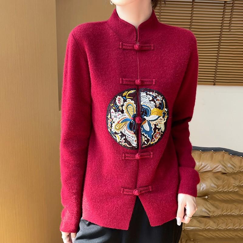 新中式国风100%纯羊毛开衫女立领盘扣刺绣针织外套宽松羊绒衫外搭