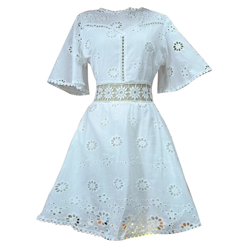 您的位置:他他商城  >  女装  >  欧美风唯美拍照镂空蕾丝连衣裙大喇叭短袖收腰A字漏背度假裙子夏