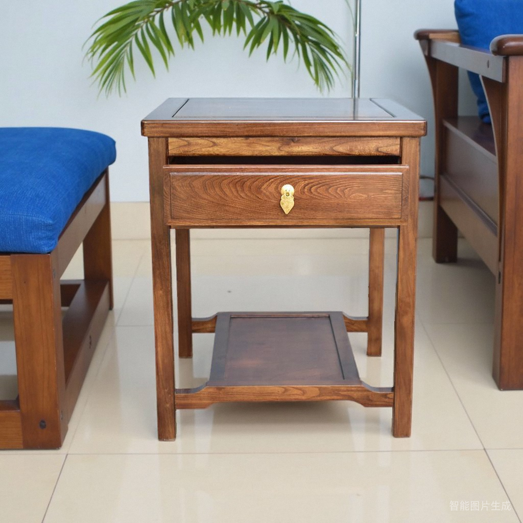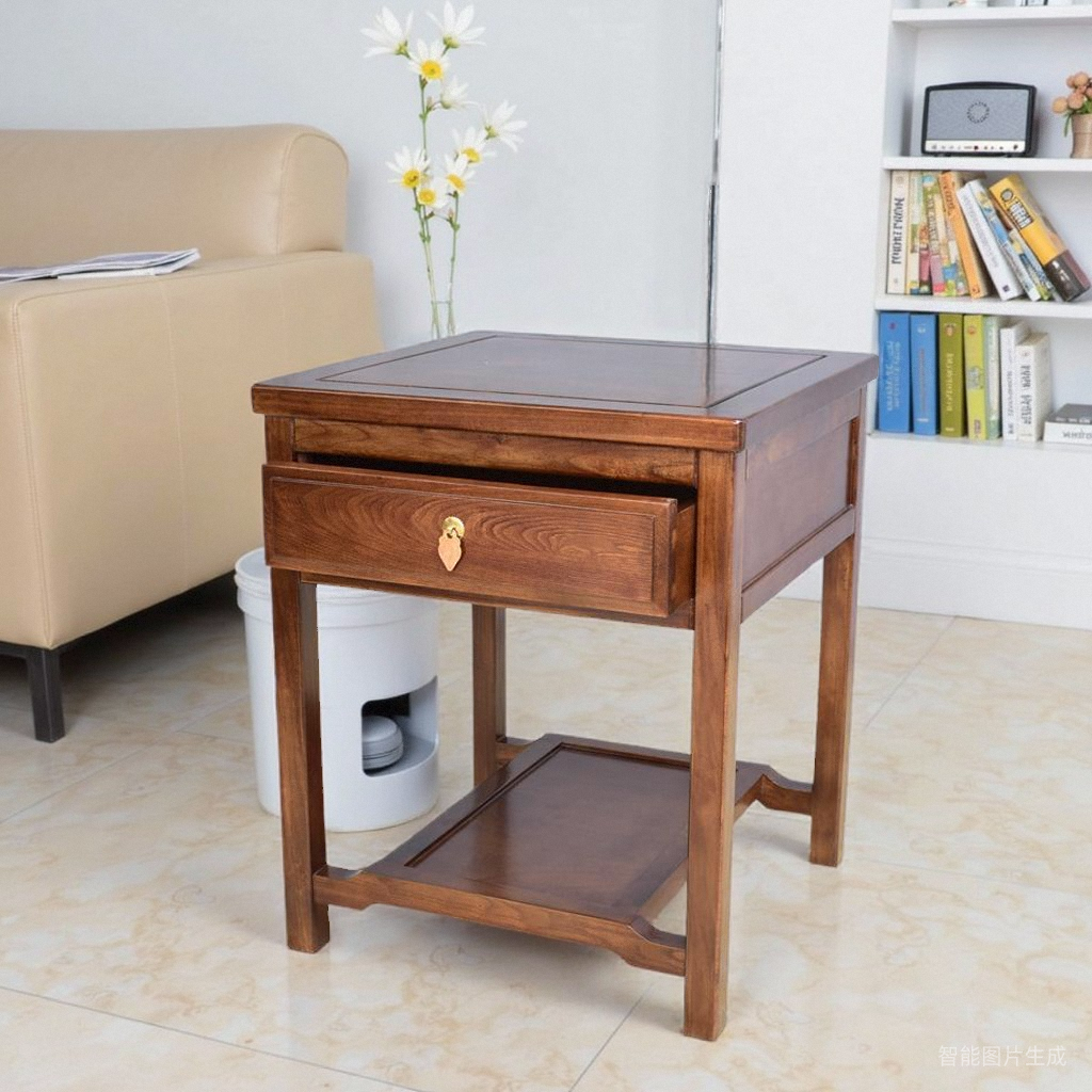 新中式全实木方几沙发角几边桌榆木小茶几原木客厅多层花几带抽屉 - 福缘木坊