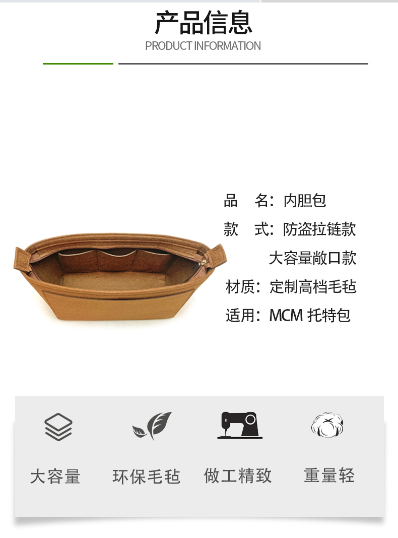 适用于MCM 中小号子母包内胆托特包购物袋收纳防盗拉链内袋
