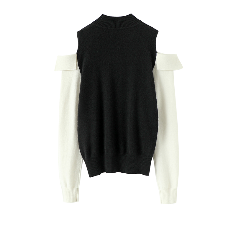 爱到心坎!黑白拼色露肩半高领羊绒衫女纯羊绒毛衣针织衫秋冬新款 - 启超官方旗舰店